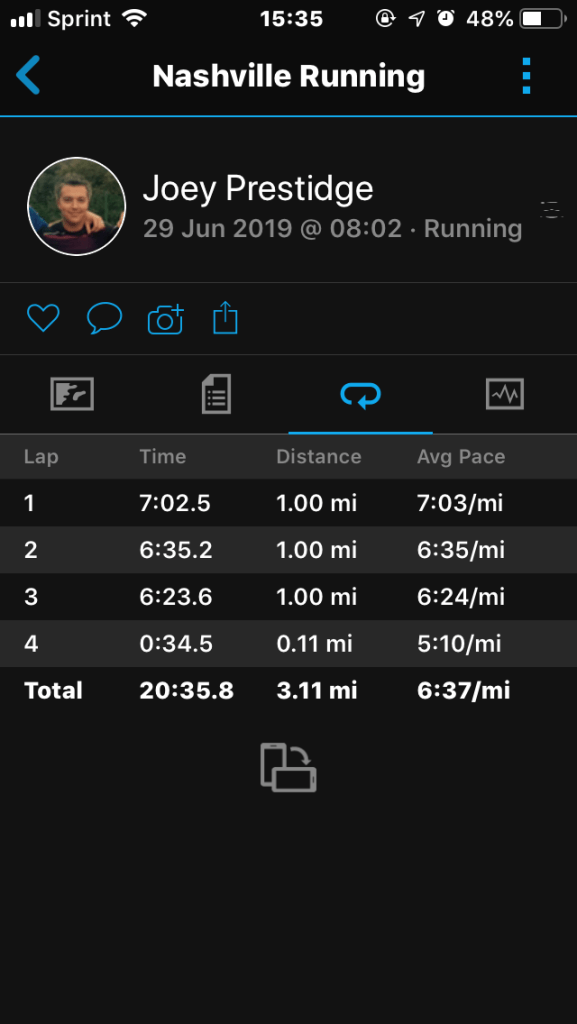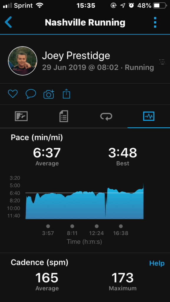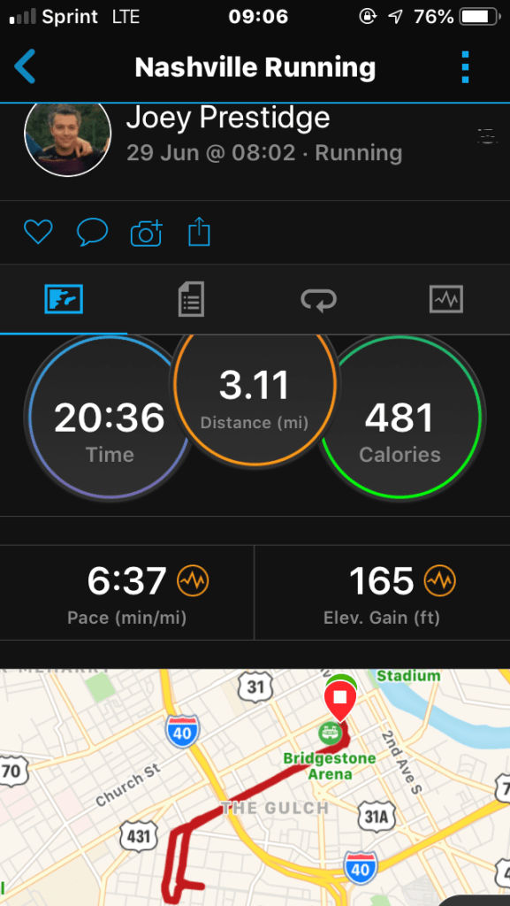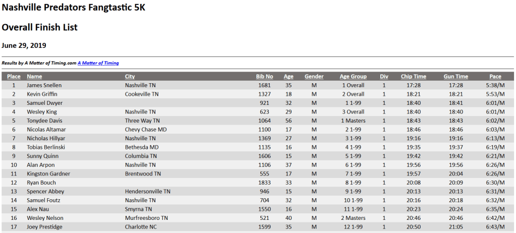 I was all signed up for the Predators Fangtastic 5K. I ran with Stocky, who had just returned back from being out on the road, and I ran a 20.36 – which felt pretty good. There was a nice downhill to finish. I ended up 17th overall.