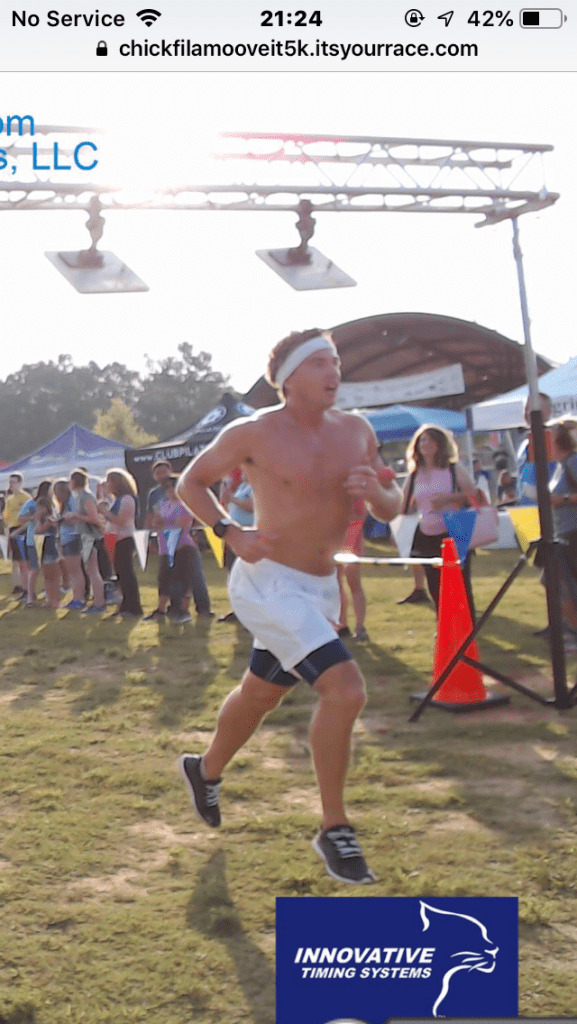 Following a recommendation from a nice lady in the school cafeteria, I had arranged a weekend getaway for Becca and me to visit Blue Ridge, Georgia. A beautiful country escape on the lake. Very much nearer the time, I investigated on runningintheusa.com and found that on the Saturday morning, not too far away from our lovely secluded cabin, there was a race! And a big one at that, 1700 runners. So I got up at the crack of dawn and drove the 1.5 hours to Canton, GA, to run The Chick-fil-A Moo’ve It 5K.