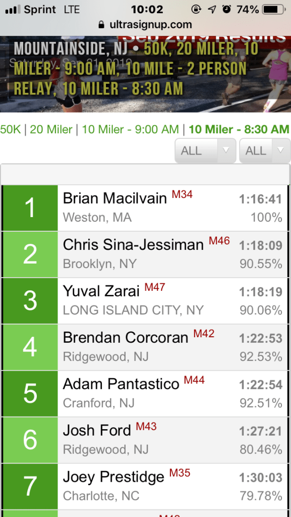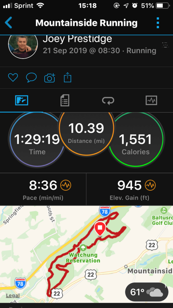 Friday after work I flew Charlotte to Newark, then walked over to the airport Marriott. I bought some expensive food from the hotel shop and went to sleep. I woke up early Saturday morning and got the airport shuttle over to Dollar Car rental. I picked up my Fiesta, and off I went to Mountainside, NJ, just outside Newark, to arrive in time for the 10 mile trail race, The Yukon Gold Rush, held at the Watchung Reservation – https://www.njhiking.com/nj-hikes-watchung-reservation/. There were 50K and 20 mile race options going on, too, as well as various relay teams, so lots of people milling around. It was a nice crowd with plenty of food and drink afterward.