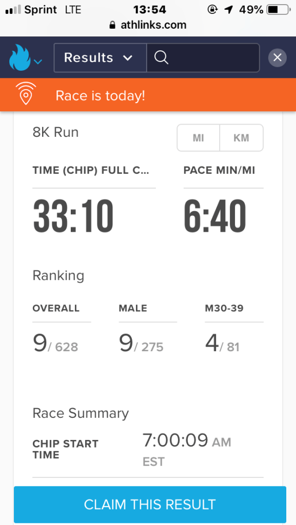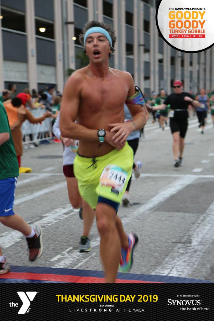 The race I found was the Goody Goody Turkey Gobble 8K. There were 4000 participants, and I finished 9th in the 8K, running a 6.31 mile pace.