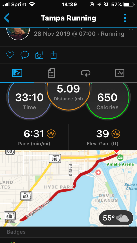I got up early and walked from our nice team hotel to the start line. The course started at the Amalie Ice Hockey arena and was very flat – great for PRing, along the nice Tampa Bay water front, and both distances (5K and 8K) looped back on to a shared course so it was a very busy last stretch coming in to finish. It was a fun race anyway. And as soon as I was done, I had to hustle back to the hotel, shower, and Uber to the hockey fields.