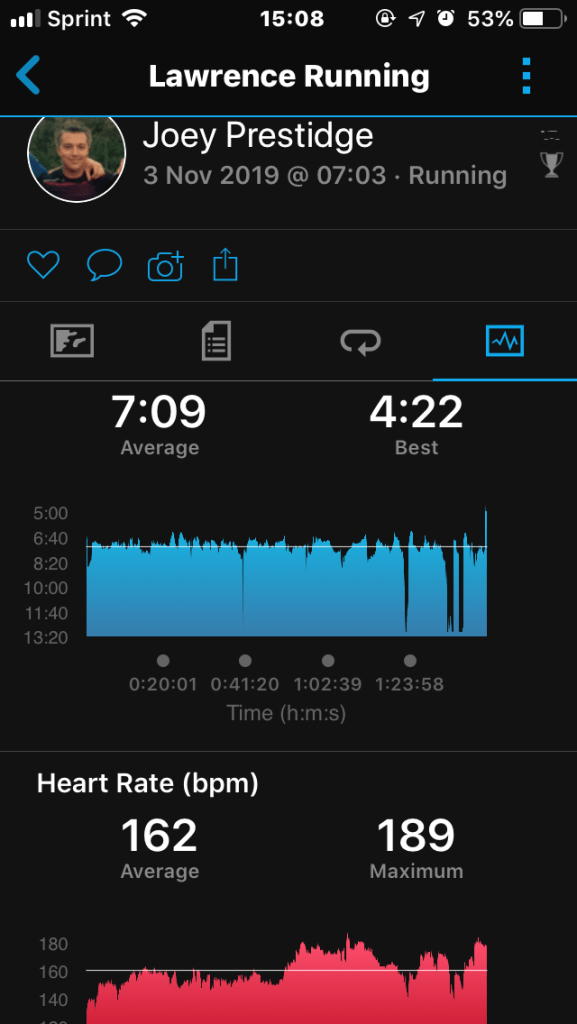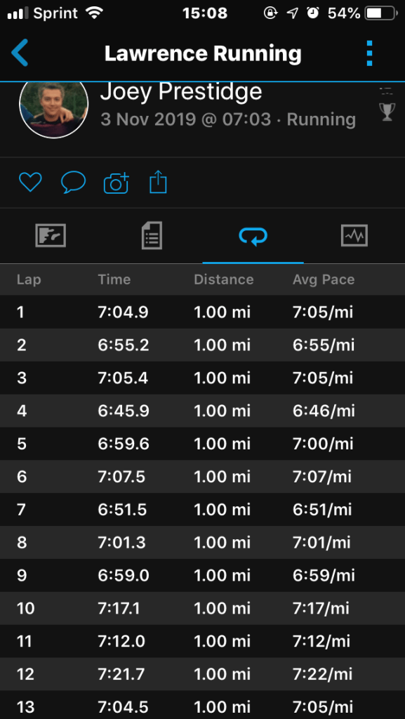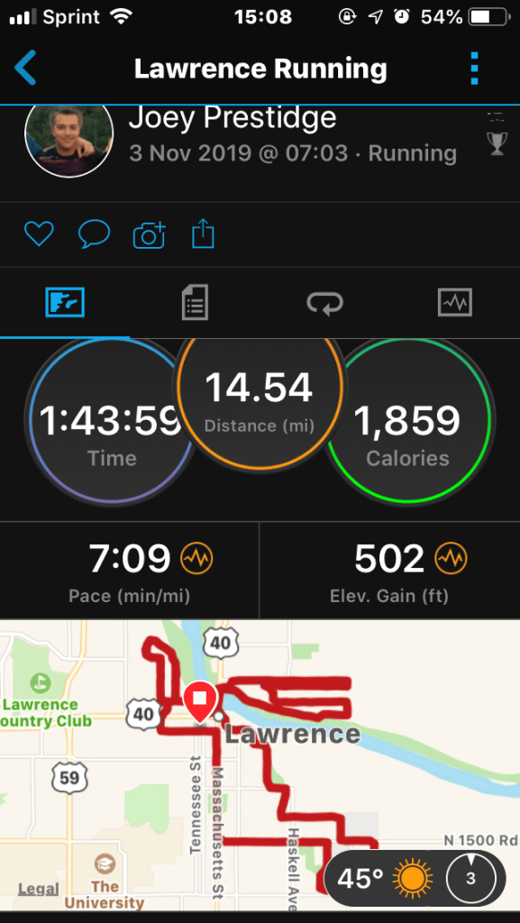 Becca and I flew to Kansas City, MO after work on the Friday, Ubered to Meg and Jeff’s in Lawrence and got to bed late. Meg and a friend were running the half with me, so the next day we went to packet pick up in the town’s nice little running store, then spent the day at the KU vs KSU college football game. We tailgated and had tickets for the game. We still got an early night then got up early on the Sunday to head to the race downtown, the Lawrence Half Marathon.