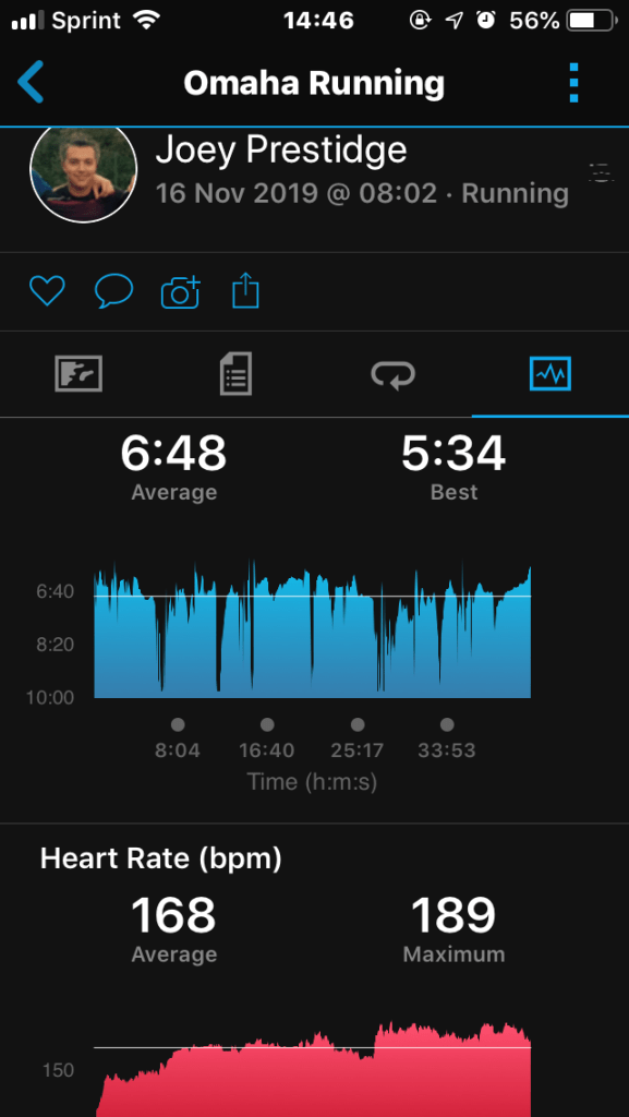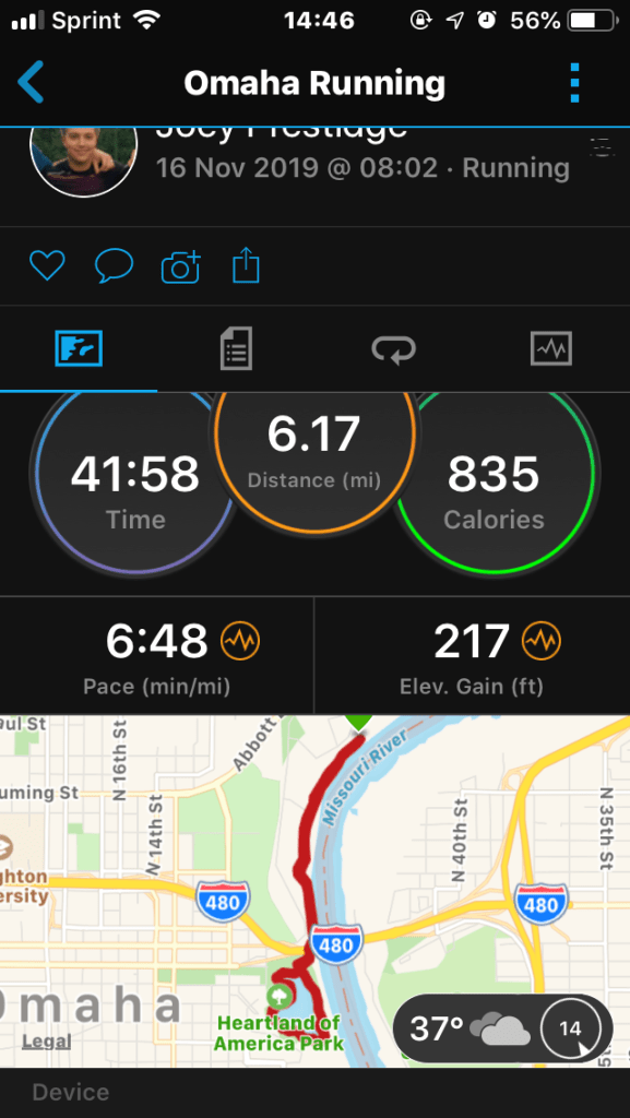 We flew Friday after work to Omaha, Nebraska, jumped on the hotel shuttle and were staying downtown – right near the College World Series baseball stadium. We went out to a fancy steak restaurant, picking up my race packet en route, then I got up early the next morning for breakfast and a hotel shuttle to the race down by the waterfront.