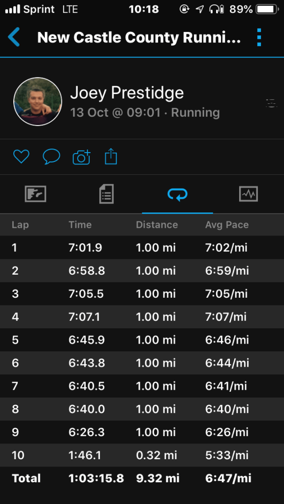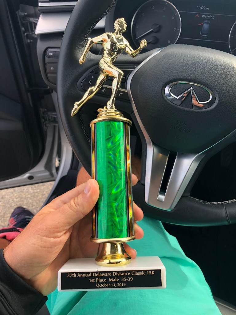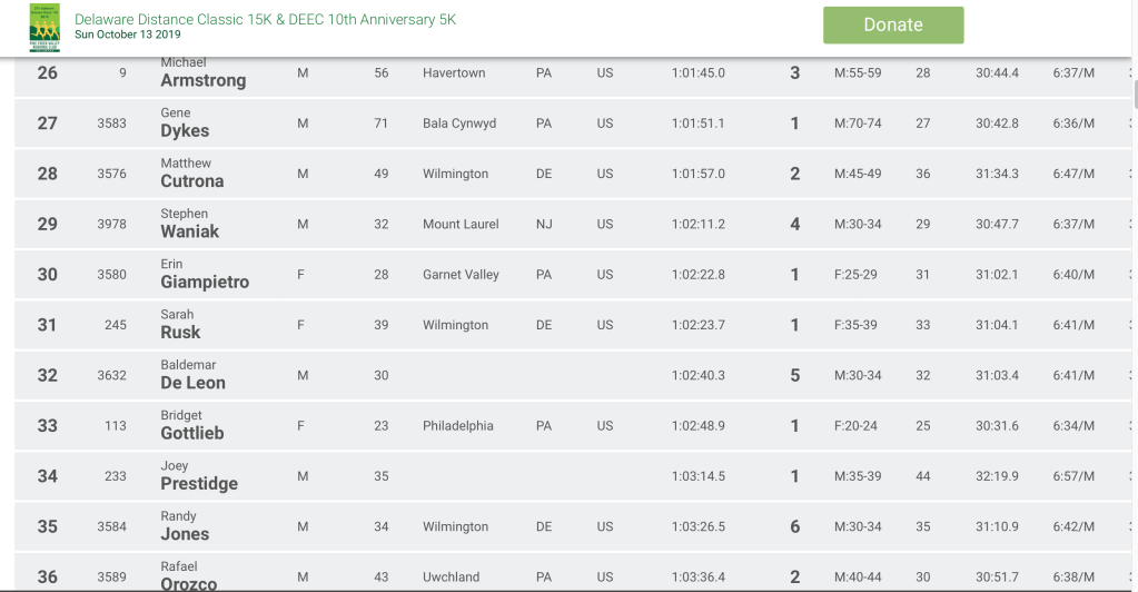 Delaware Distance Classic 15K – USATF Championship and Grand Prix. Overall Place: 34 out of 224 – Age Group Place: 1 M 35-39 – Chip Time: 1:03:14.5 – Pace: 6:48/M/mile.