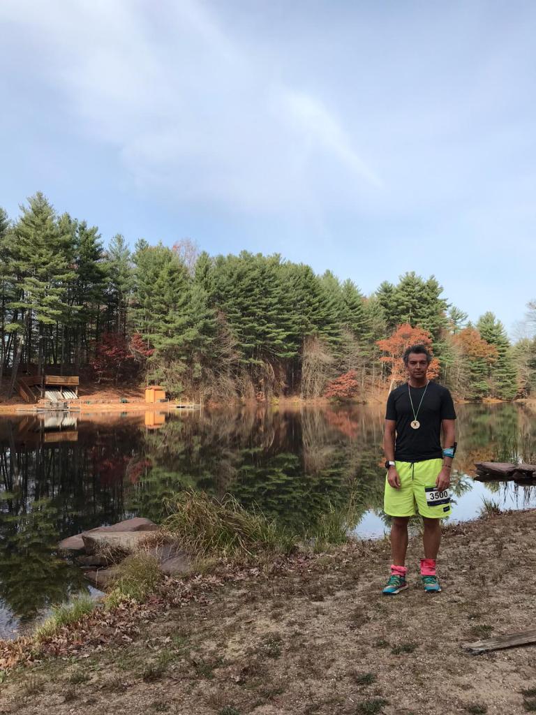 The course was long – approx 6.7 miles – and I clocked a time of 50.35. My 10K time was 48 mins which isn’t bad for a hilly trail. The going was tough, not technical per se, but the soft fine mud and sand covered by loose leaves and dense pine needles – made things slippy. The directional orange arrows were also spray painted on top of the leaves which was interesting.