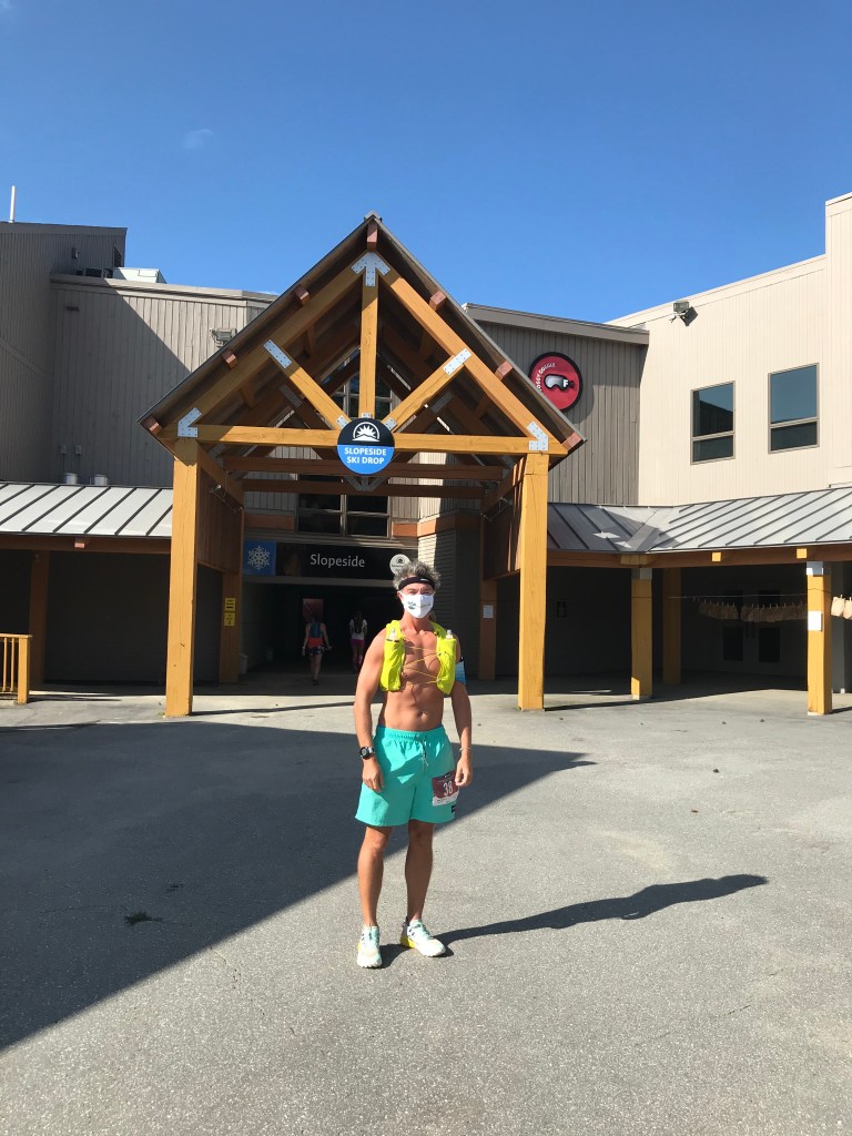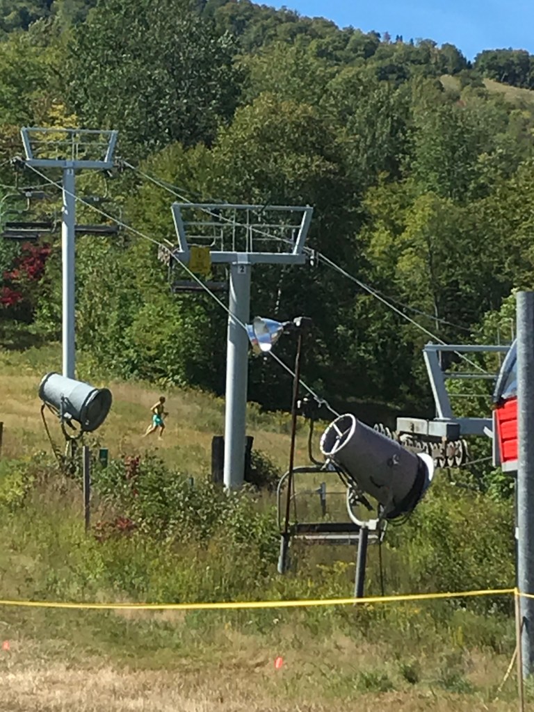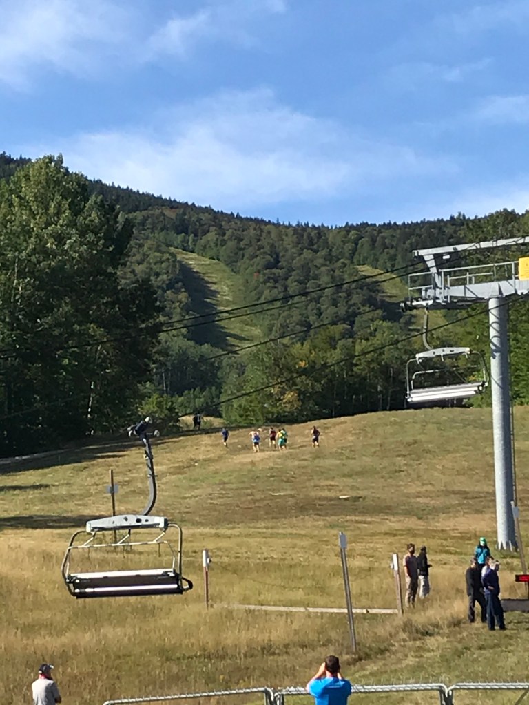 The next morning was Saturday, and race day. The nice old inn keeper, Sandra, had kindly offered me some Cheerios for breakfast, even though their kitchen facility was closed due to COVID. So I ate, hydrated, packed all my stuff – vest, gels, hydration, poles, mask… and drove us the short distance to Sunday River ski resort. I picked up my race packet, checked my poles were locking telescopically, and made my way to the start line. Having previously been asked to submit our best 5K times, I was first wave in the half marathon, and we headed out promptly at 1000.