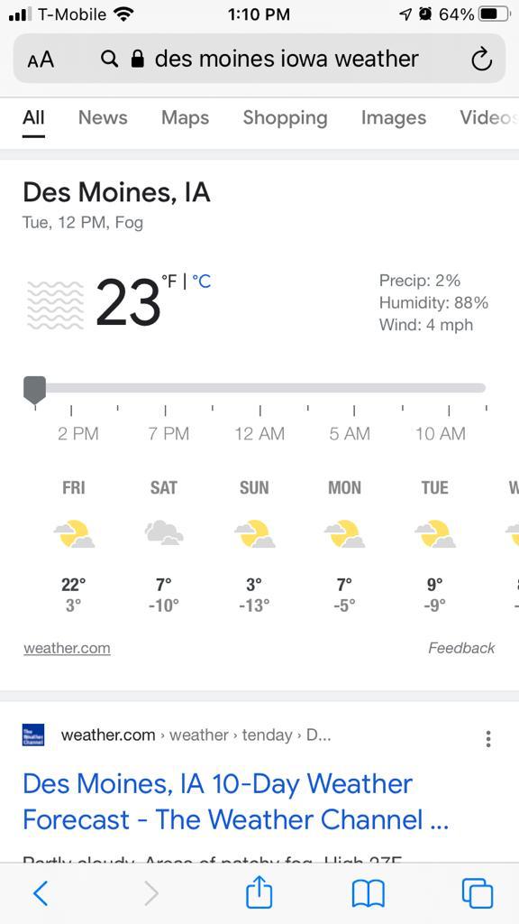 We left Charlotte Friday morning. The truck was having some bed cover work done, so we Lyfted to the airport with a fellow Joseph, a nice older gentleman, who used to be in the navy. We touched down in Des Moines around 1300, picked up our snowy bags and Hertz rental (a classic Nisan Rogue, which was about to be put through its paces), and headed out into the tundra.