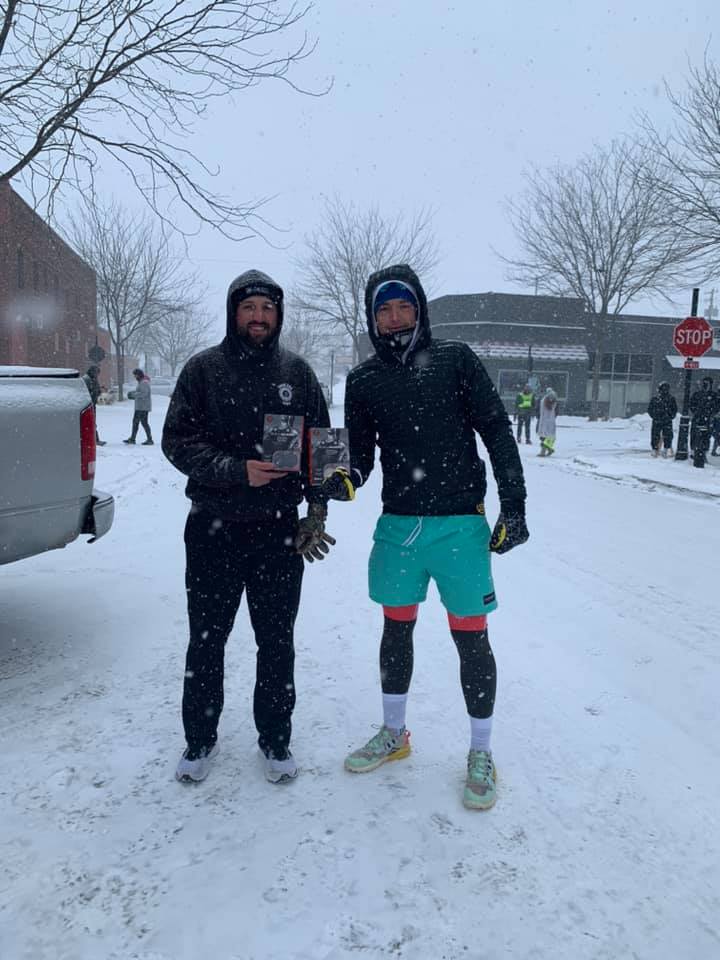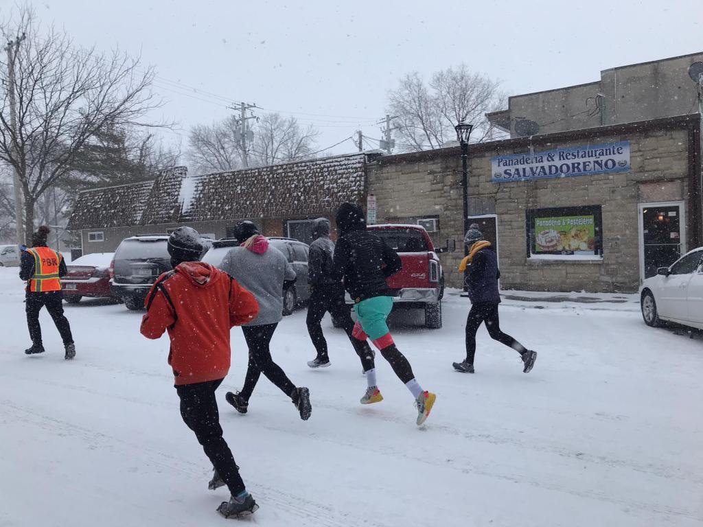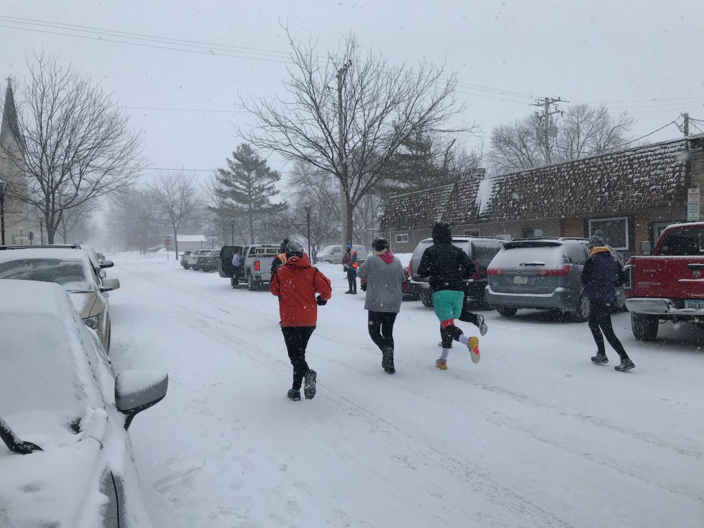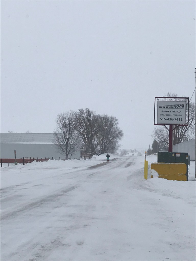 Saturday morning came, snow was falling, the wind was blowing, and the hotel festivities for the BRR ride had begun with music and fanfare. The BRR ride is a cycling event that happens the first Saturday in February every year. Riders from all over travel in the freezing temperatures from Perry to Rippey and back. It was the festivities of this event that three years ago, spurned the creation of the accompanying PBR Half Marathon, courtesy of a keen runner and fantastic local man, Zachary Norgren.