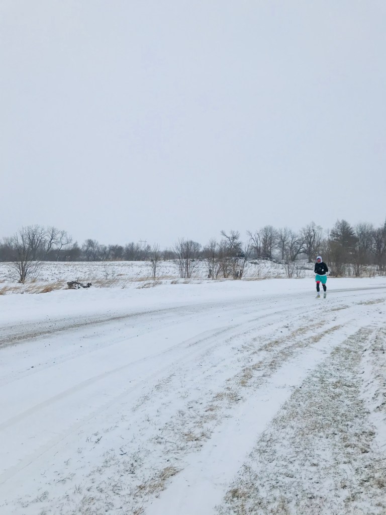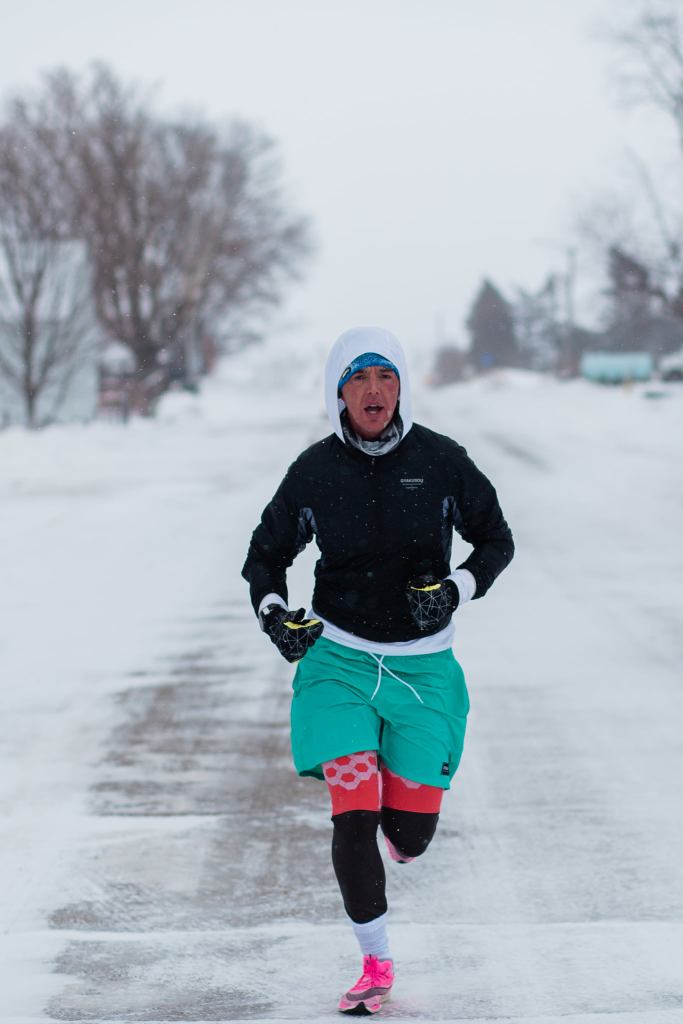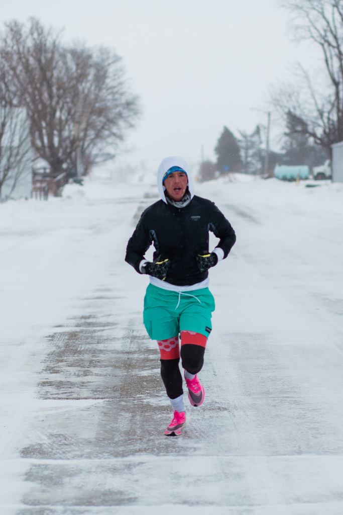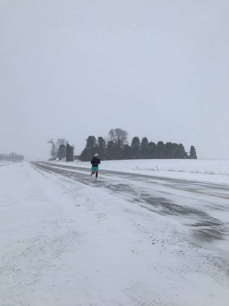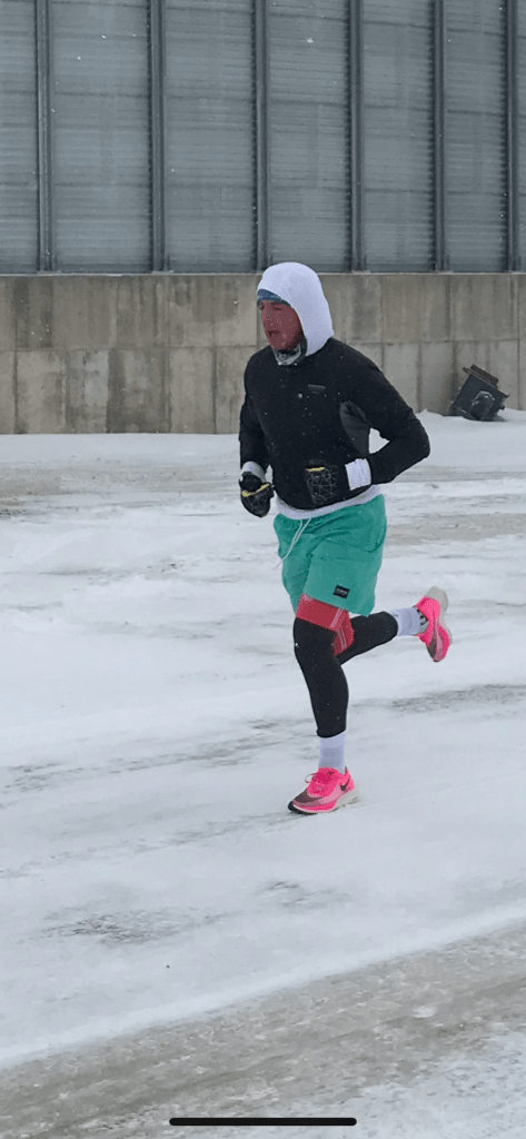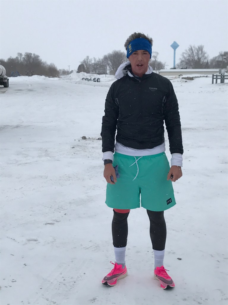 The last stretch was pretty painful – my mouth was frozen open – which was fine for breathing, but not great for spitting any saliva away, so my cheek froze solid with ice. The road was either OK to run on, due to the cross wind being so powerful that it blew all the snow away off the surface – or terrible to run on because the snow had not been blown away, due to the coverage from the violent wind provided by a barn or silo in the field. The mittens/gloves really were a lifesaver, maybe literally so.