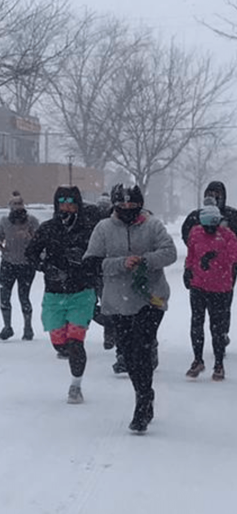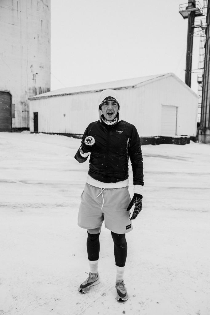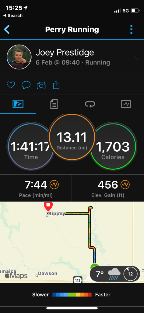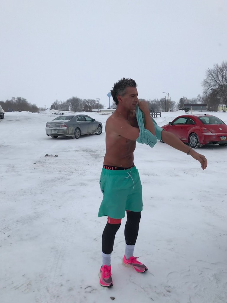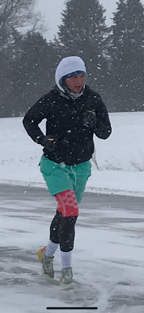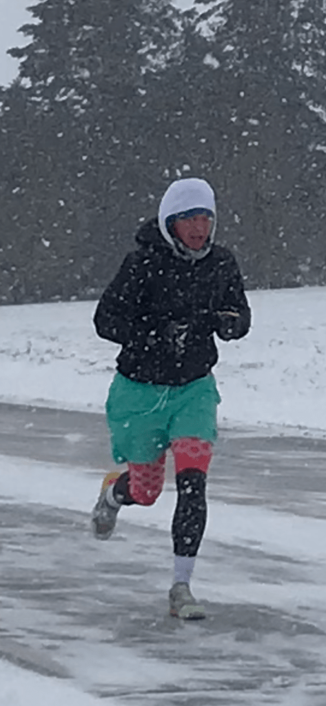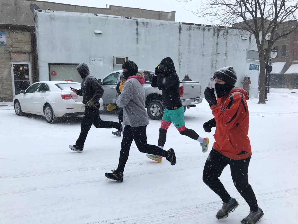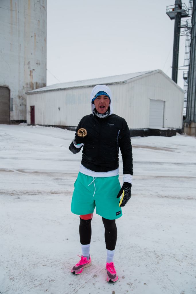 The last stretch was pretty painful – my mouth was frozen open – which was fine for breathing, but not great for spitting any saliva away, so my cheek froze solid with ice. The road was either OK to run on, due to the cross wind being so powerful that it blew all the snow away off the surface – or terrible to run on because the snow had not been blown away, due to the coverage from the violent wind provided by a barn or silo in the field. The mittens/gloves really were a lifesaver, maybe literally so.
