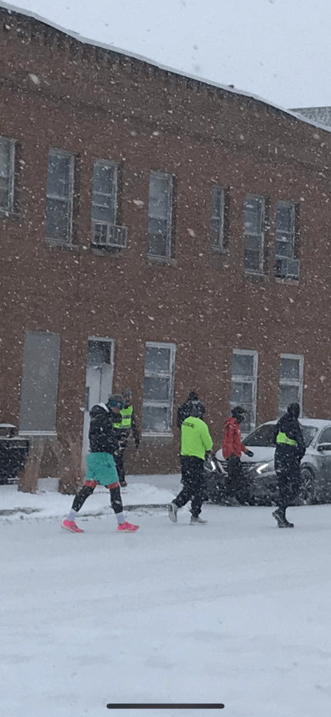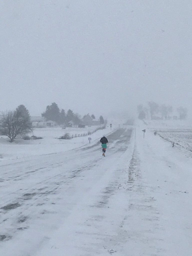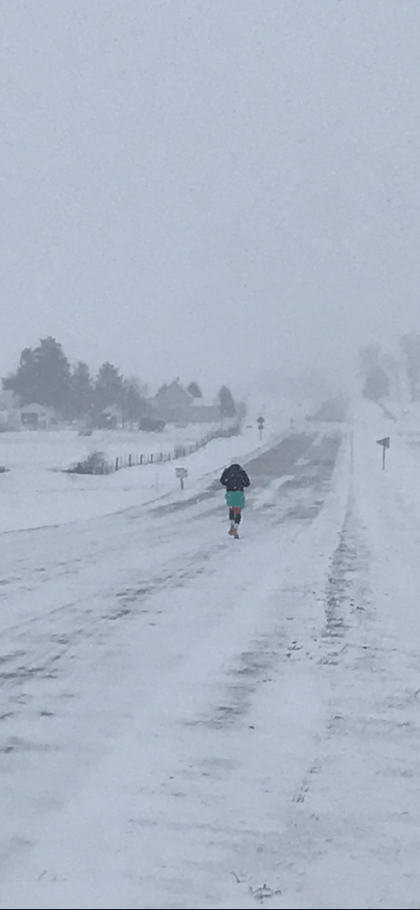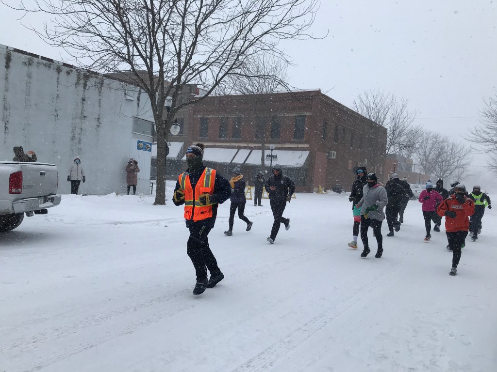 The race started slowly and coldly (6 degrees, approx -14 C). I ran with Zachary for the first two miles or so. We saw a local truck driver donutting in the snowy street, let a couple of runners take the lead and chatted for a while. It was good to get a feel for the terrain, the weather, and just to get to know Zachary a bit more. Our RD peeled off at the first aid station and I pressed on, got some music going in my right headphone and took the lead around mile 4. The wind was shooting in from the right and the snow continued to come down heavily. “Snow on snow on snow on snow”, as Bert Jansch sings. I left my hood up, found that running with a face covering over my mouth was too difficult, and noticed that it was now so cold that anything elastic – hamstring sleeves, iPhone arm band, legging waistband – all stopped working. They just stayed in their stretched position, losing all elasticity.