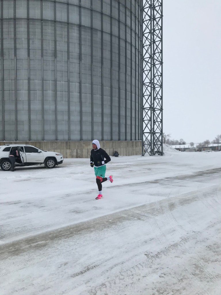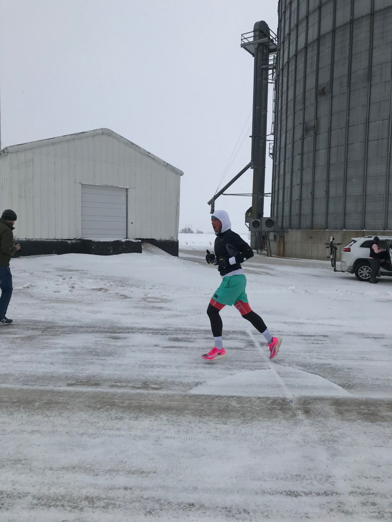 About mile 6 I had a gel, removed my jacket and gave it to Becca through the car window – my one person race support team who was following/leading diligently in the Rogue – and pressed ahead to Berkeley for the loop I had practised the day before. On the run out of Berkeley, I experienced the only mile of the race where it was not head on wind and snow, and tried to get my pace up a little. The cold was really limiting blood flow to my muscles, so any push for speed was incredibly difficult, I just felt heavy, slow and cumbersome. This little push out of Berkeley even gave me a twinge in my hamstring, probably because the muscles just couldn’t warm up properly, so I didn’t stress it too much, and stayed on an even pace before turning right for the last 5 miles, down the long straight road for the finish in Rippey. This was the road that had been gritted, so around mile 9-10, I was able to stop, meet Becca to change into my lighter Vapor Flys as forementioned, and take in another gel – which Becca had had to carry so it didn’t freeze in my pocket.