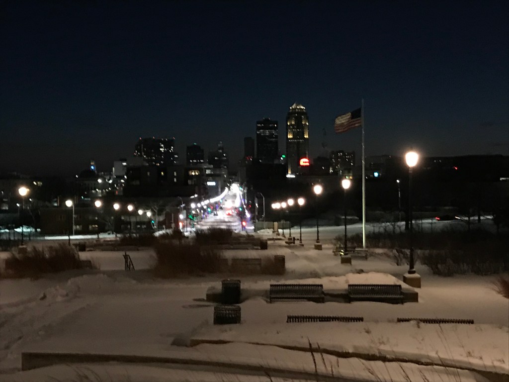 We then headed out to explore Water Works Park in Des Moines. We drove and walked around the beautiful snowy expanses of the river park, and after exploring the banks of the frozen river, even stumbled across a Dodge Challenger stuck on a snow bank. A group of us tried to push it out but the AWD wheels unfortunately just wouldn’t bite.