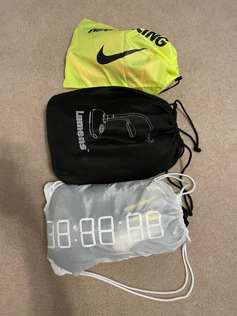 What I wore – AE Flex Boxer, Gyakusou leggings, Balega Enduro 2 Crew 200, Next% Vapor Flys (soon to be changed to me Nike Wildhorse Trails), hamstring supports, shorts, Skins baselayer, Nike aerovent T, Nike Therma Sphere hooded long sleeve top, Gyakusou windbreaker, Nike Aeroloft jacket, Garmin watch, iPhone & armband, Neck Gator and neck warmer/mask, Sweden headband, Oakley sunglassses for the blowing snow, neoprene undergloves from my work colleague Bryan, plus my new purchase – the fantastic Nathan HyperNight Reflective Convertible Glove/Mitt Galaxies. All this to say, I wore all that, and was still absolutely frozen when I got to the start line, where by the way, I looked round to see lots of the runners set up in trail shoes with YakTrax over the top (like snow chains for car tires). I thought “Oh dear…” and quickly changed into my trail shoes. They served me fine until the last five miles, where, now ion a well gritted road, I was able to stop for 30 seconds and switch back to my road shoes – with a little help from Becca to tie the laces as my hands were still numb!