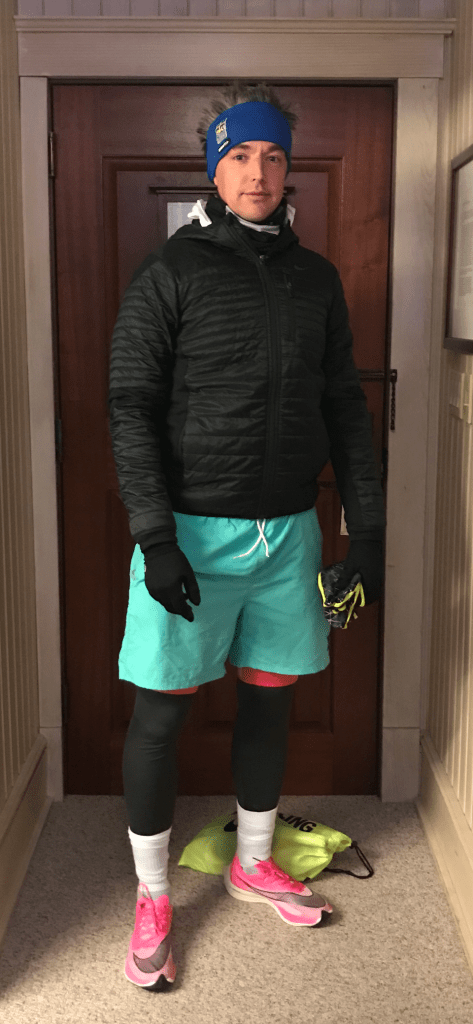 Before checking in to the hotel, we drove the course, to get a feel for the terrain, any elevation, and to figure out if the snow was settled on the road or if there was gritting, whether it was icy, and what type of running shoes would be best.
