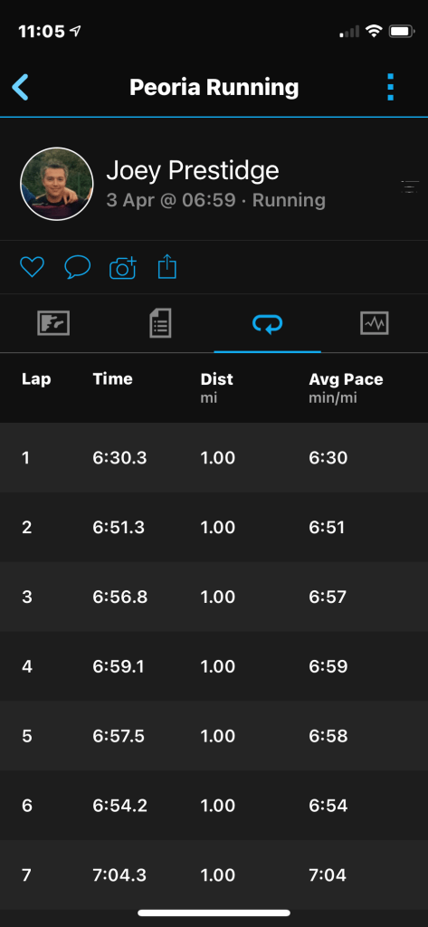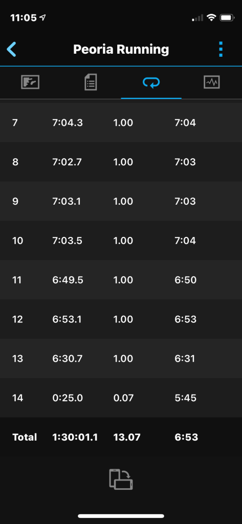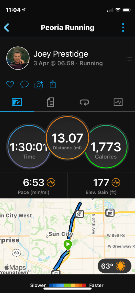 We met a guy called Kevin from Indiana at the start line, and the same guy who had won my half at Hoover Dam, won this race, too. Again, in 1.17! This is my race data –