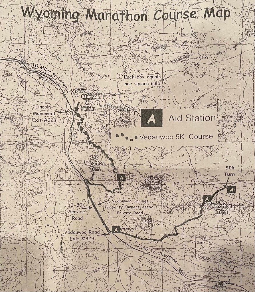 It was 46 degrees and cloudy, but not raining. The race started at 0700 so we left Laramie at 0615, to head the Abraham Lincoln Monument at the entrance to the Medicine Bow National Forest. I’d managed to lose the soft flex flask I’d bought at packet pick up to mitigate the cupless aid stations but not to worry.