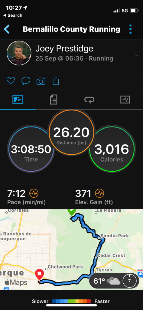 That said, with one more long run scheduled in my training for Chicago, it seemed like a good idea for me to increase my sign up from the half to the full for this weekend’s Sandia Crest Marathon point to point event. Two weeks before the Chicago marathon…