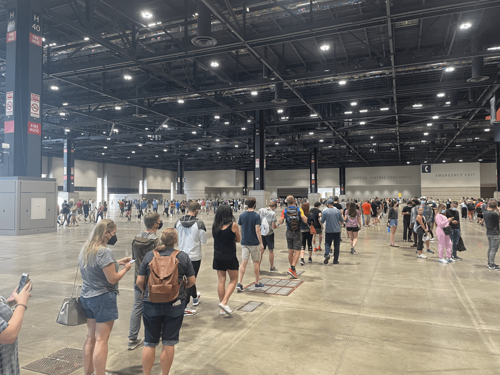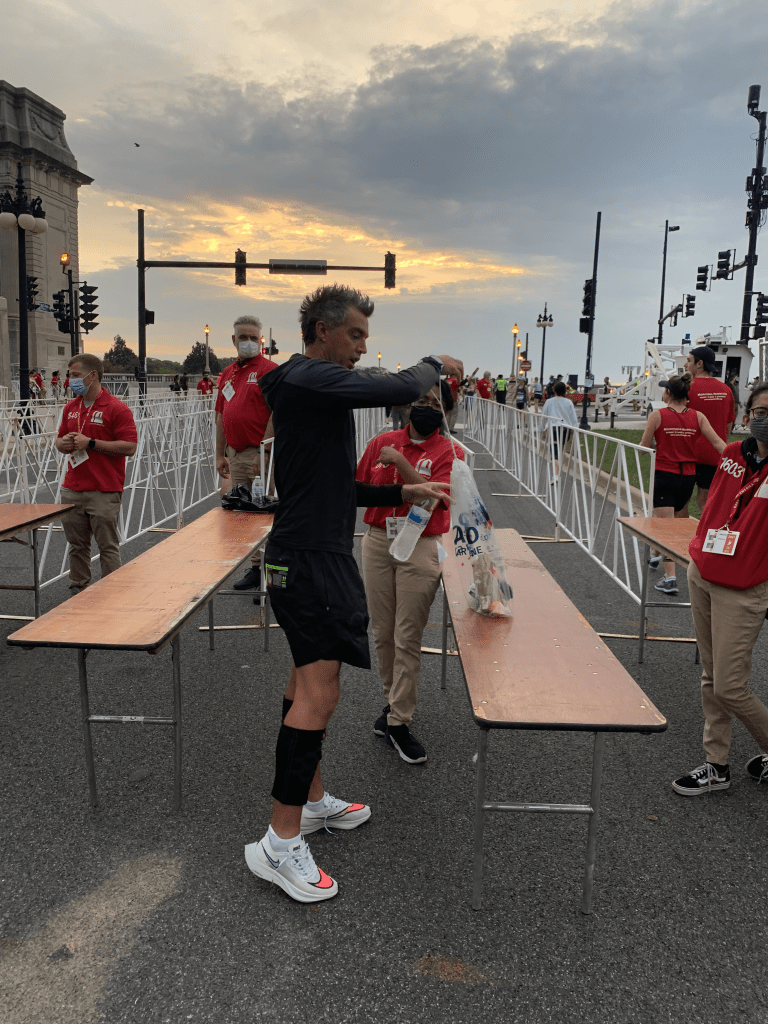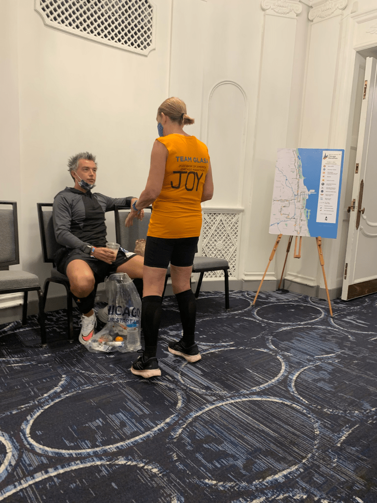 We headed to the Expo, grabbing lunch at Chipotle en route, walking and using the green line. The Exhibition Center was miles away, a nightmare to get to, and had no signs externally or internally – ridiculous. When we eventually got in where we needed to be, we had to join the longest snaking queue I had even stood in, and meander along for an hour or so. Then we showed our vaccine cards like Europeans aboard a Nazi train, and were allowed in, to join another queue to pick up our race packet, and another to pick up our T-Shirt etc. Then I had to check in with GLASA, the charity I was running for, and still had time for a look around the expo before they started to close it down around 1730 or so. My GLASA fundraising page – https://fundraisers.hakuapp.com/joey-prestidge