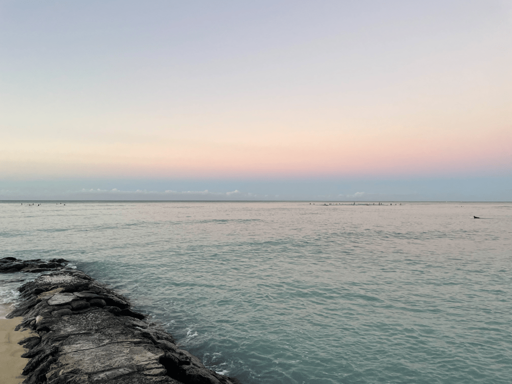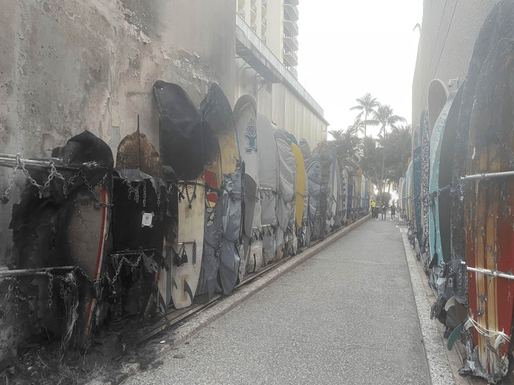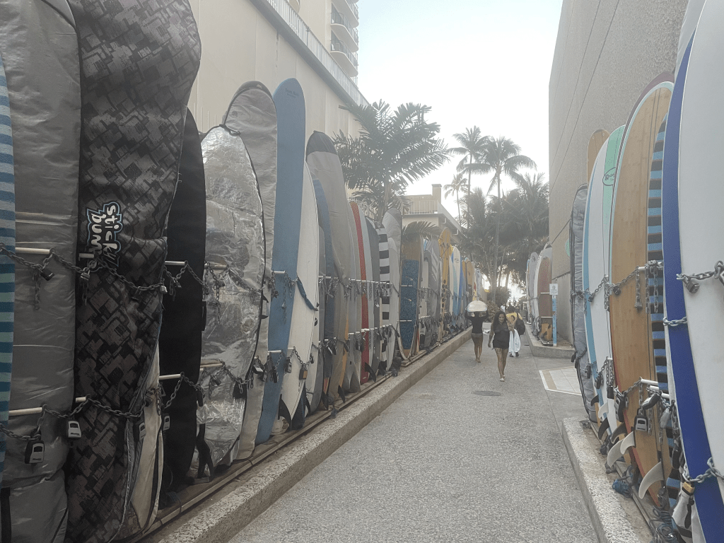 Saturday morning, I woke up early and went out on the beach to watch the sun come up whilst walking along the shore. I found The Waikiki Wave hotel (now closed) – where I had stayed with friends when I last visited, and checked out Duke’s Alley – a famous surfboard lock up location, recently the unfathomable victim of a serial surfboard arsonist.