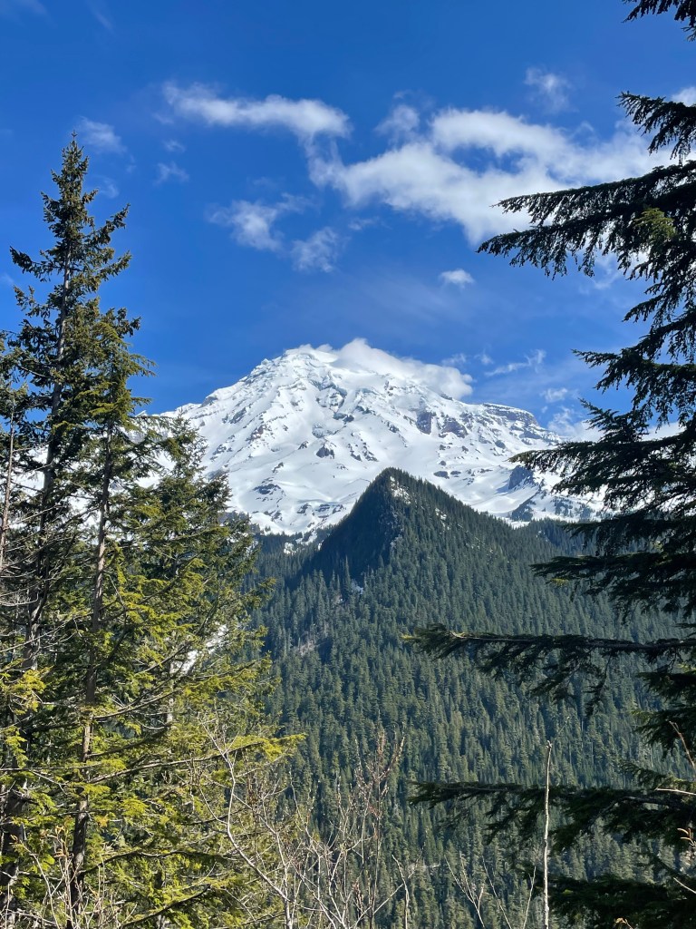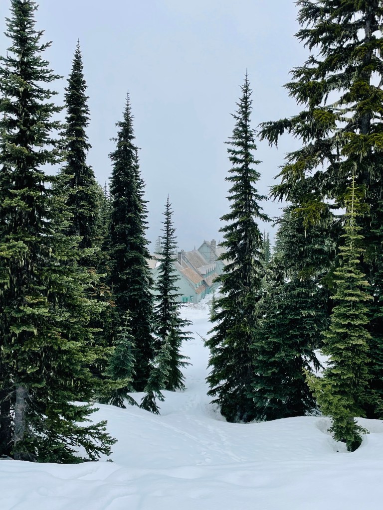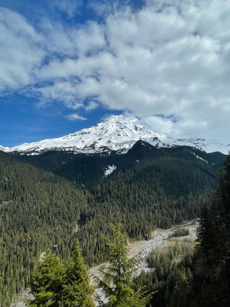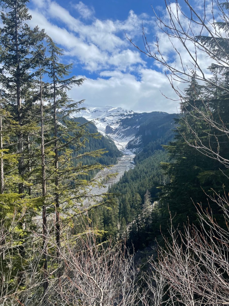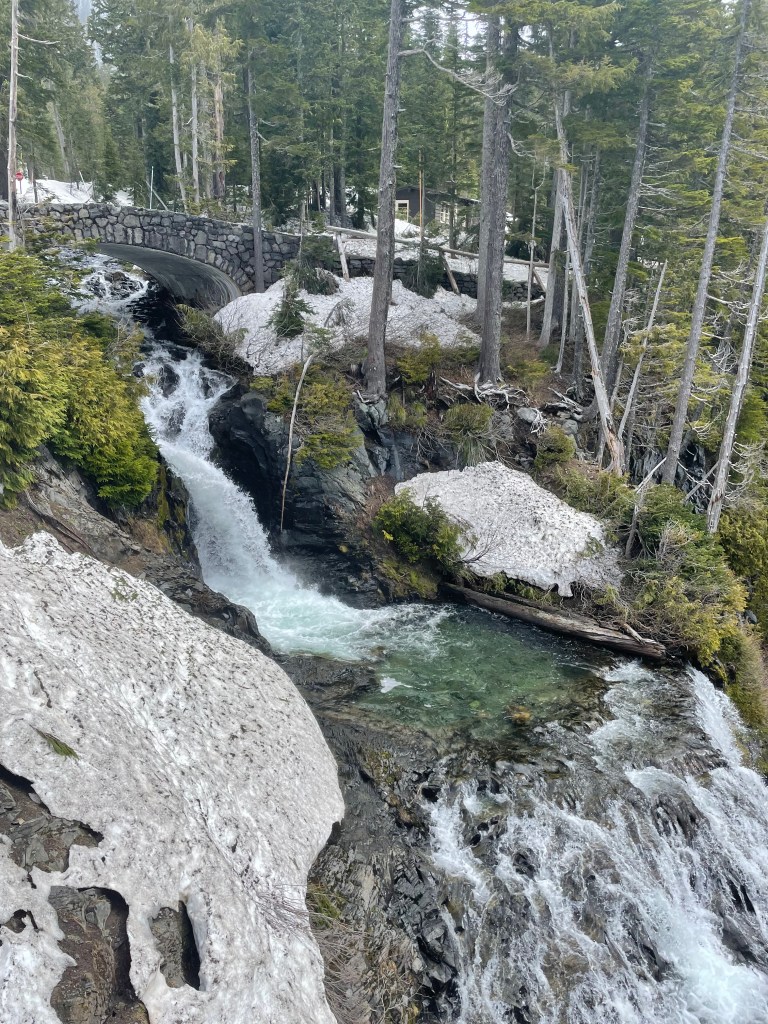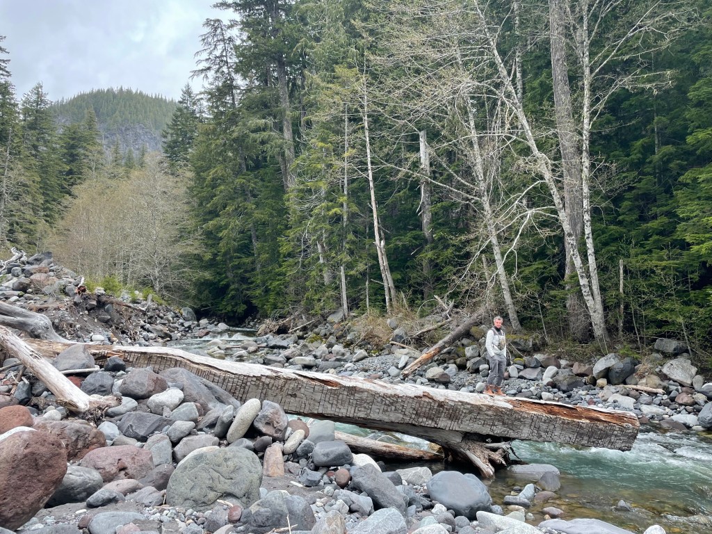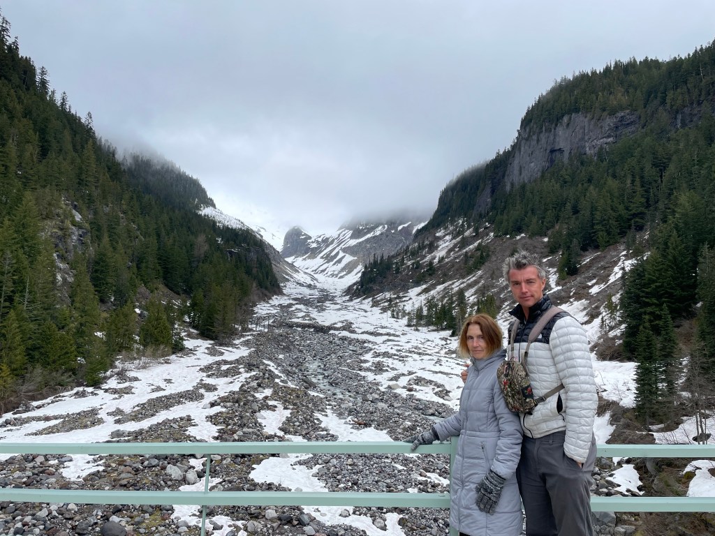 Monday morning we rose early and headed into the park. We explored the Longmire Visitors Area and walked the short Trail of The Shadows. We drove on, and up, exploring some vistas en route, and ended up parking at Paradise Visitors Area. We have a good go of walking the Skyline Trail but thick snow carpeted the foothills of the cloud obscured volcanic mountain stretching up from us, and going was tough. We headed back after a good trek and drove back down the mountain. We stopped to explore the Carter Falls Glacier area and river, then grabbed a very overpriced and average lunch back at the Longmire Cabins area. We then walked the five to six mile Rampart Ridge Trail, with 1400’ elevation gain, lots of muddy snow, and some uncertainty over route…then headed back to our lodgings.