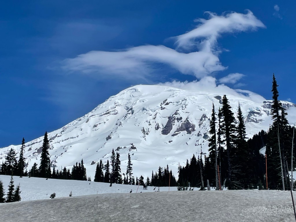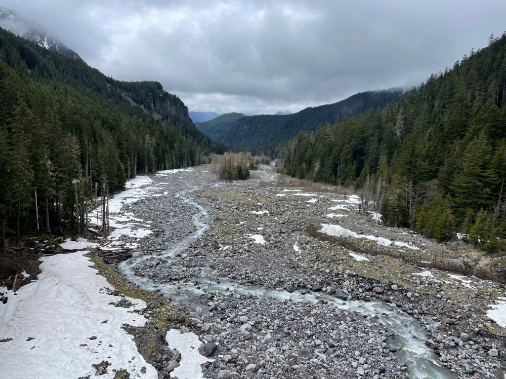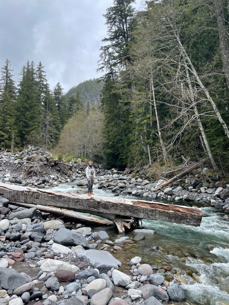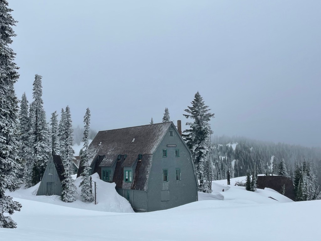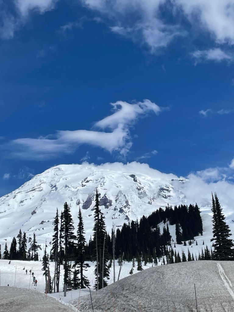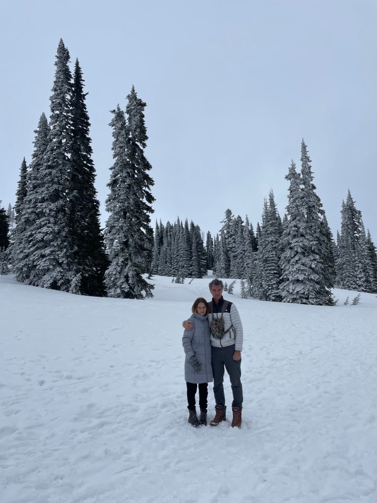 Monday morning we rose early and headed into the park. We explored the Longmire Visitors Area and walked the short Trail of The Shadows. We drove on, and up, exploring some vistas en route, and ended up parking at Paradise Visitors Area. We have a good go of walking the Skyline Trail but thick snow carpeted the foothills of the cloud obscured volcanic mountain stretching up from us, and going was tough. We headed back after a good trek and drove back down the mountain. We stopped to explore the Carter Falls Glacier area and river, then grabbed a very overpriced and average lunch back at the Longmire Cabins area. We then walked the five to six mile Rampart Ridge Trail, with 1400’ elevation gain, lots of muddy snow, and some uncertainty over route…then headed back to our lodgings.