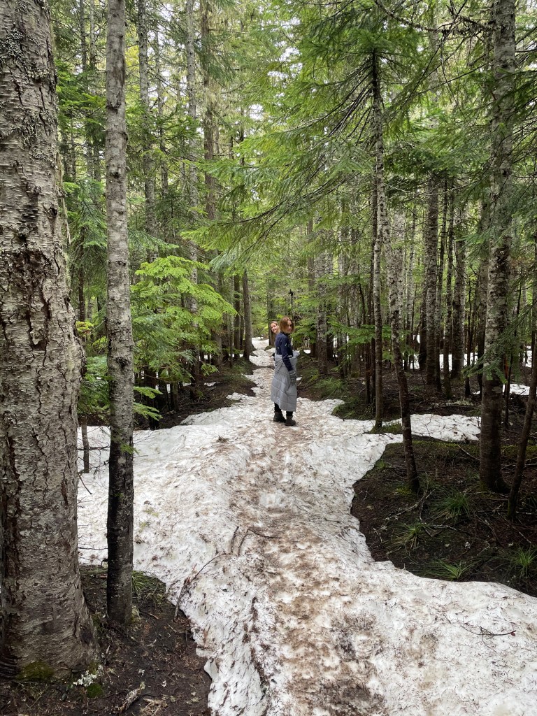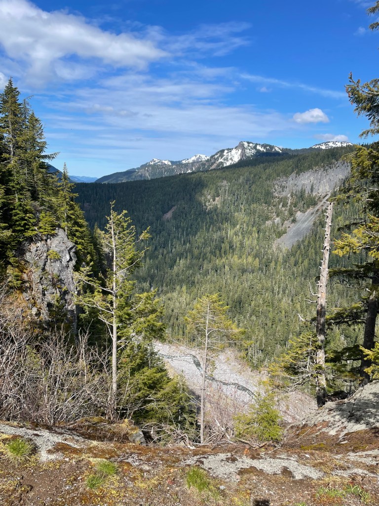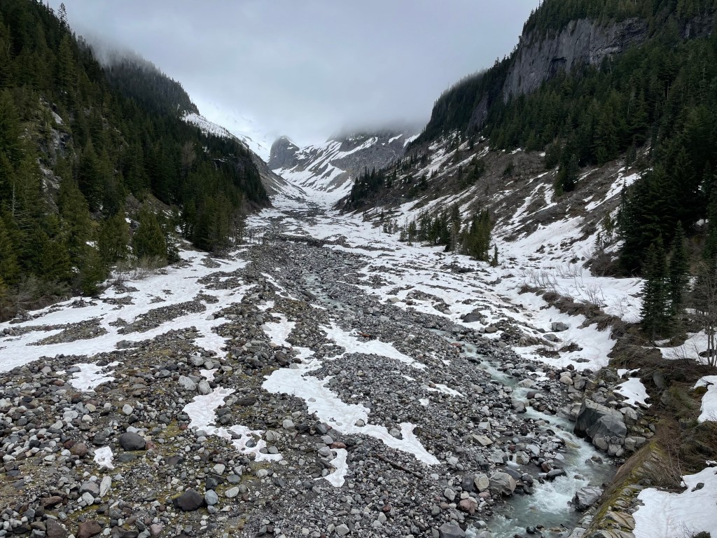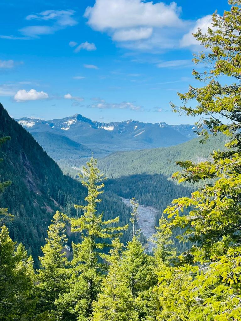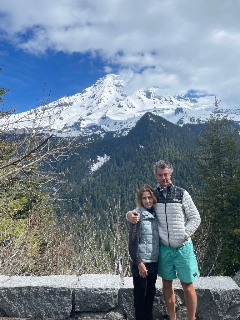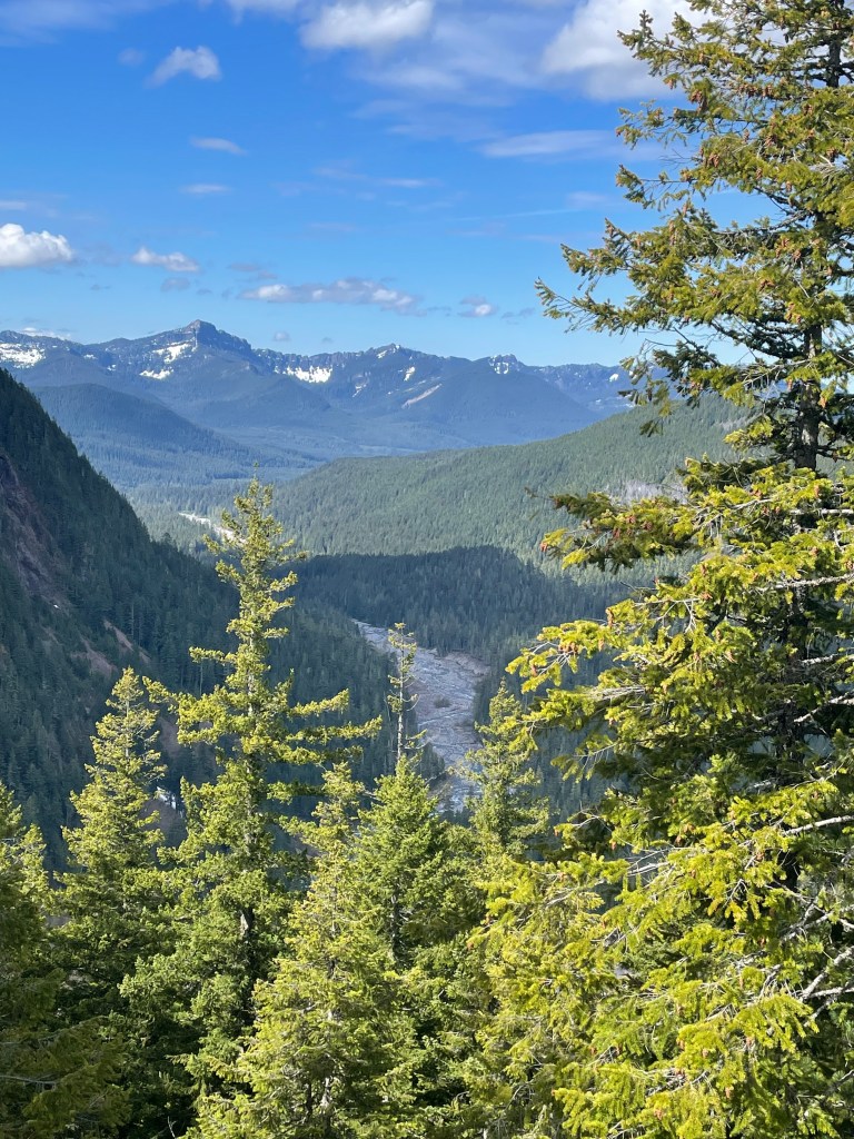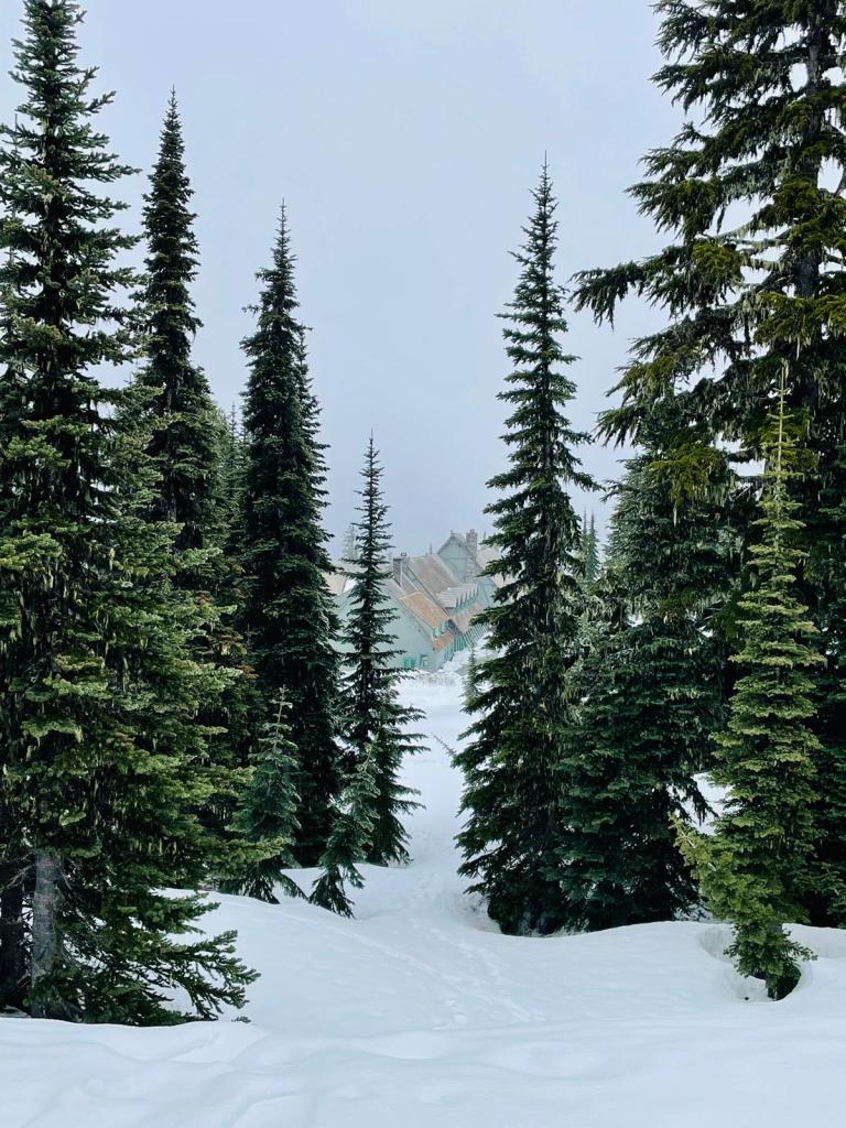 Monday morning we rose early and headed into the park. We explored the Longmire Visitors Area and walked the short Trail of The Shadows. We drove on, and up, exploring some vistas en route, and ended up parking at Paradise Visitors Area. We have a good go of walking the Skyline Trail but thick snow carpeted the foothills of the cloud obscured volcanic mountain stretching up from us, and going was tough. We headed back after a good trek and drove back down the mountain. We stopped to explore the Carter Falls Glacier area and river, then grabbed a very overpriced and average lunch back at the Longmire Cabins area. We then walked the five to six mile Rampart Ridge Trail, with 1400’ elevation gain, lots of muddy snow, and some uncertainty over route…then headed back to our lodgings.
