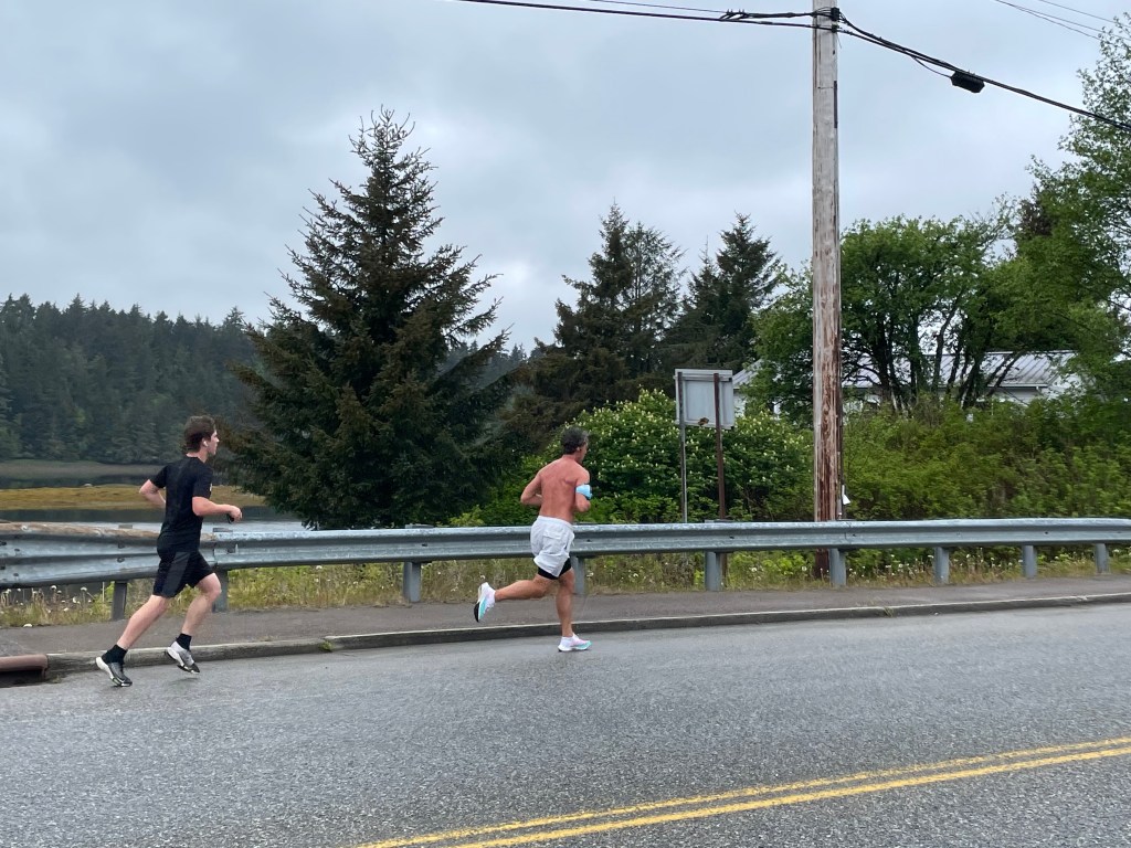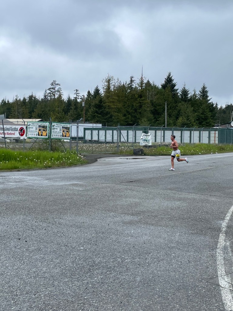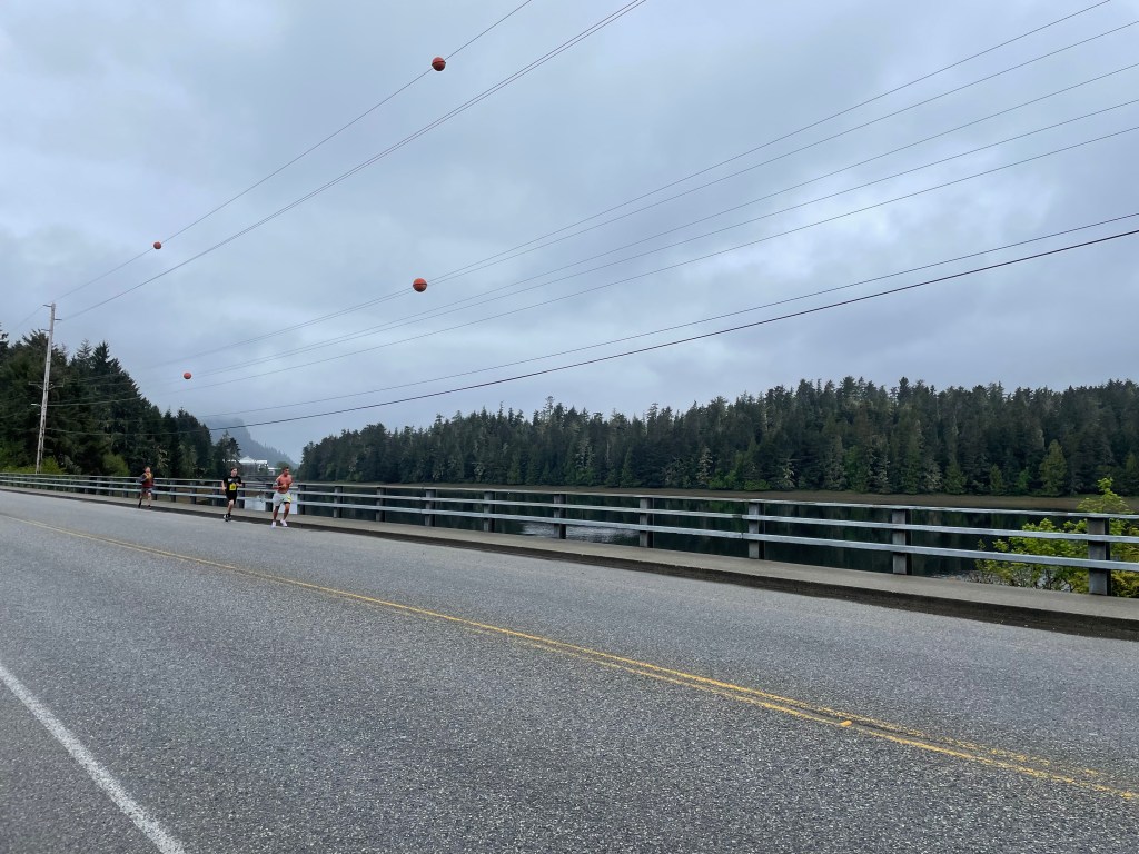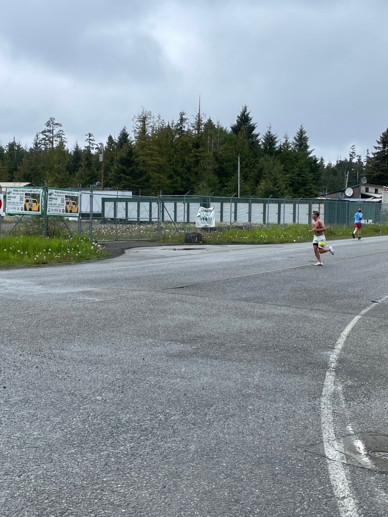 The race started, with kids everywhere, but the pack soon spread out. With one pony tailed guy racing out at a crazy pace (he ended up finishing first, running a 1.11) then me and two guys tucked in tight behind me, in a slip stream. The course was picturesque with the beautiful coastline often stretching out as far as the eye could see on one side of the road, trees, mountains and rigorous lumber work on the other side of the road. A regular stream of cars drove past us tooting horns, ringing bells and shouting support for the runners. Especially for the local hero, who was one of those tucked in behind me.