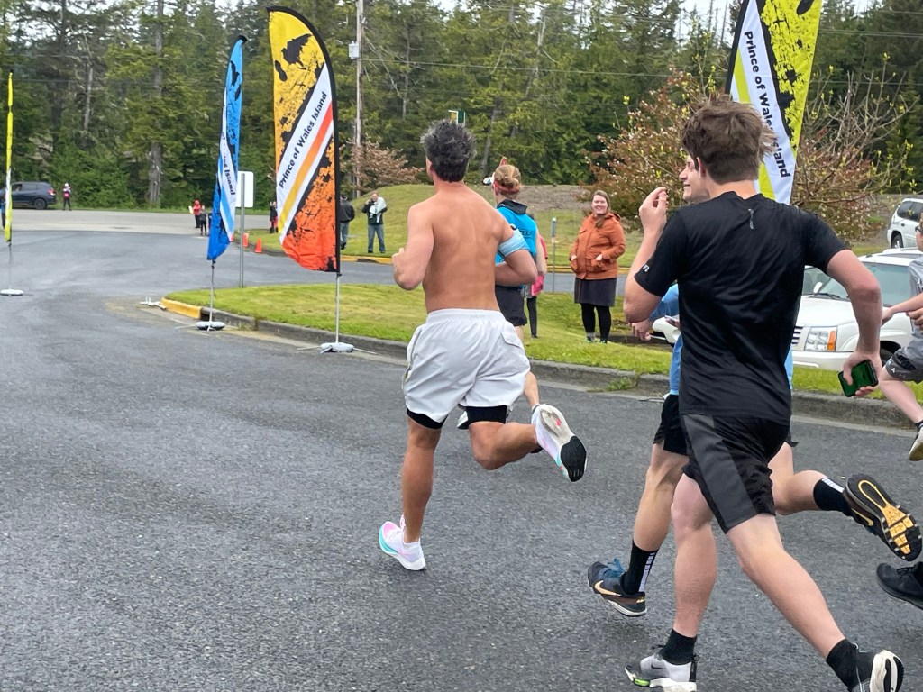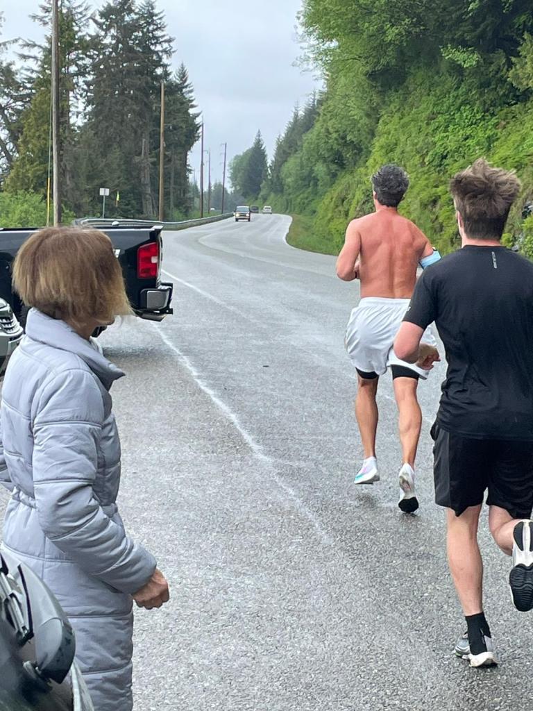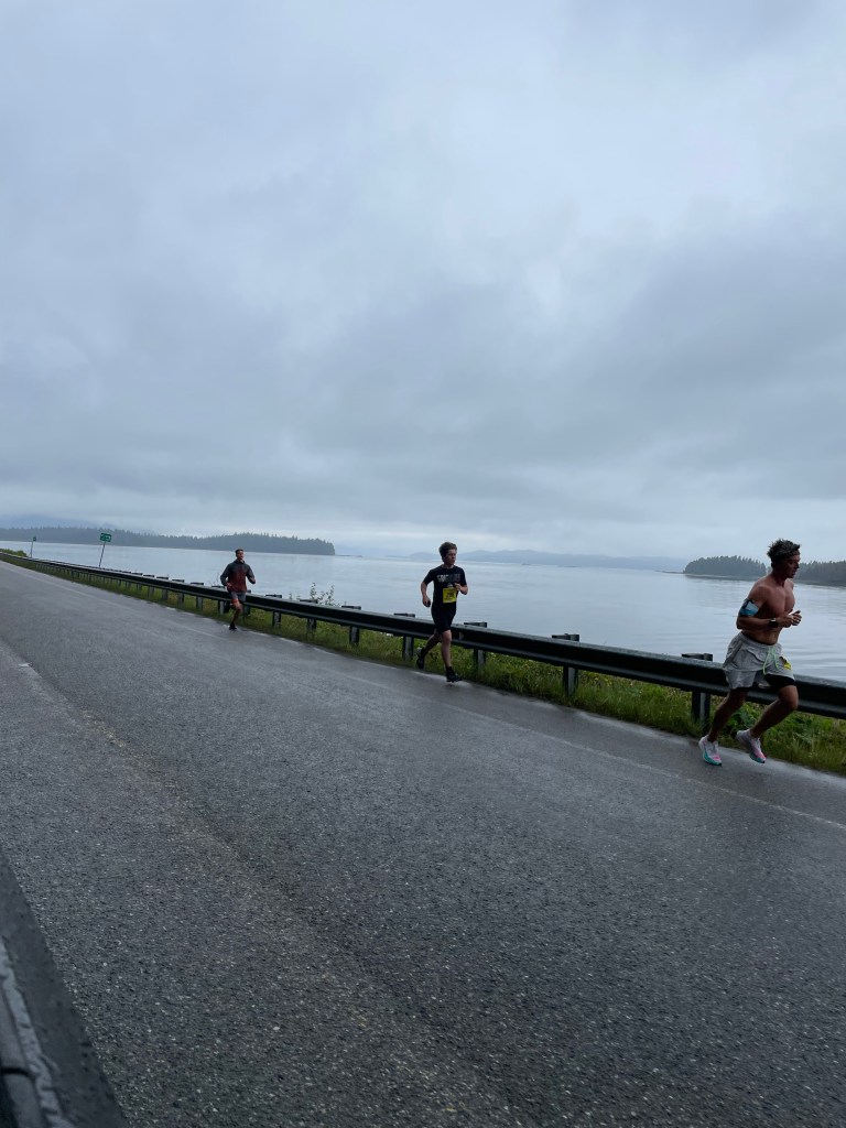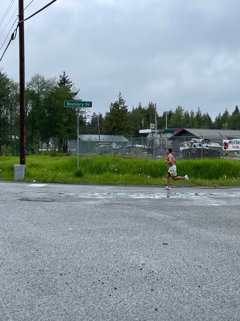 The race started, with kids everywhere, but the pack soon spread out. With one pony tailed guy racing out at a crazy pace (he ended up finishing first, running a 1.11) then me and two guys tucked in tight behind me, in a slip stream. The course was picturesque with the beautiful coastline often stretching out as far as the eye could see on one side of the road, trees, mountains and rigorous lumber work on the other side of the road. A regular stream of cars drove past us tooting horns, ringing bells and shouting support for the runners. Especially for the local hero, who was one of those tucked in behind me.