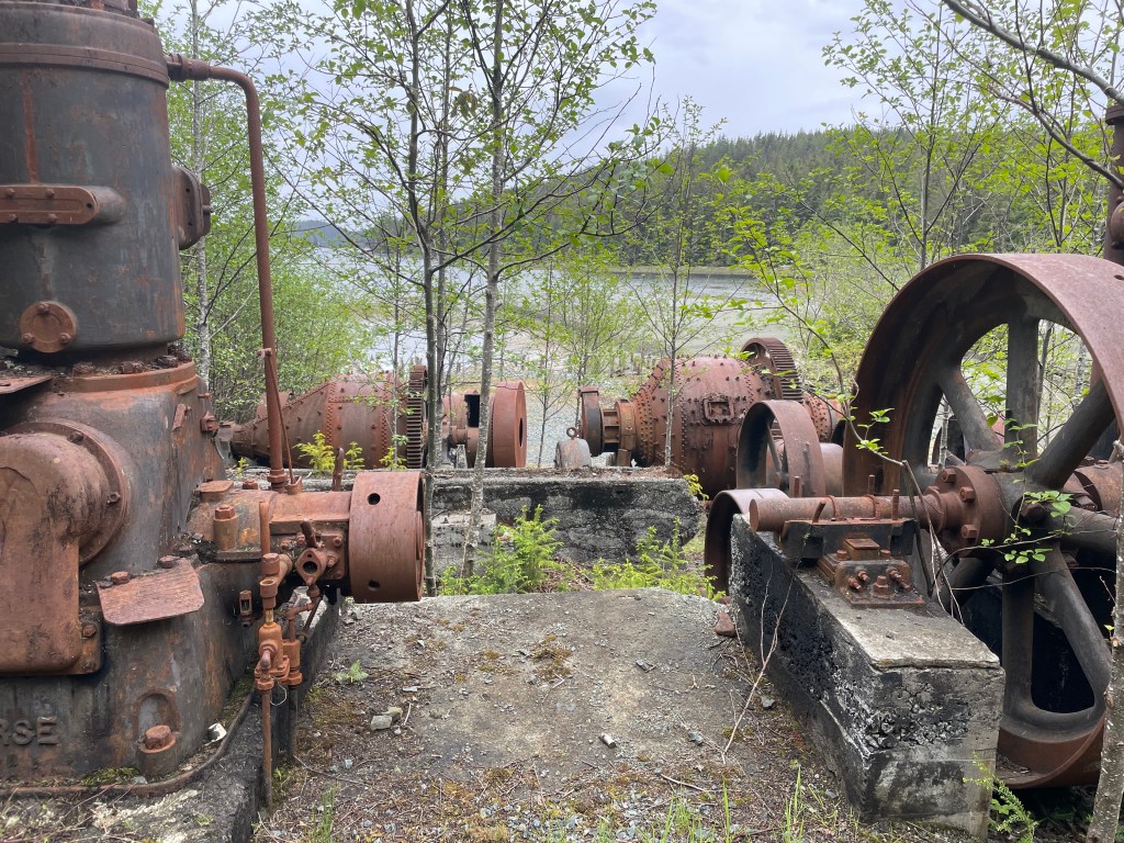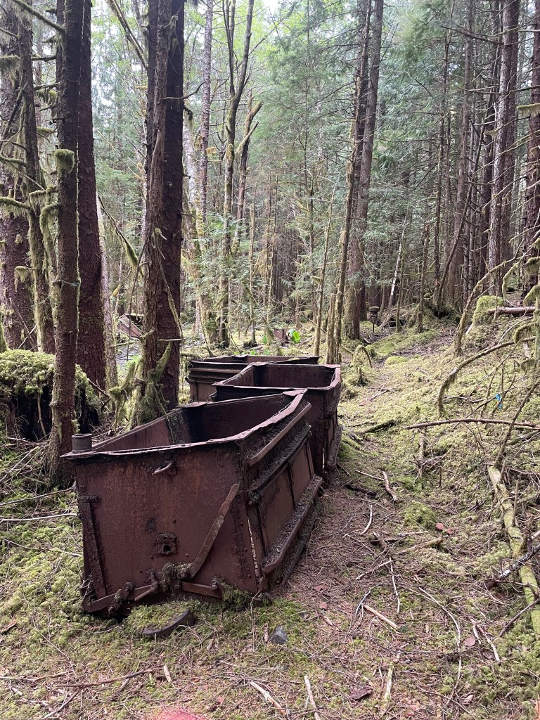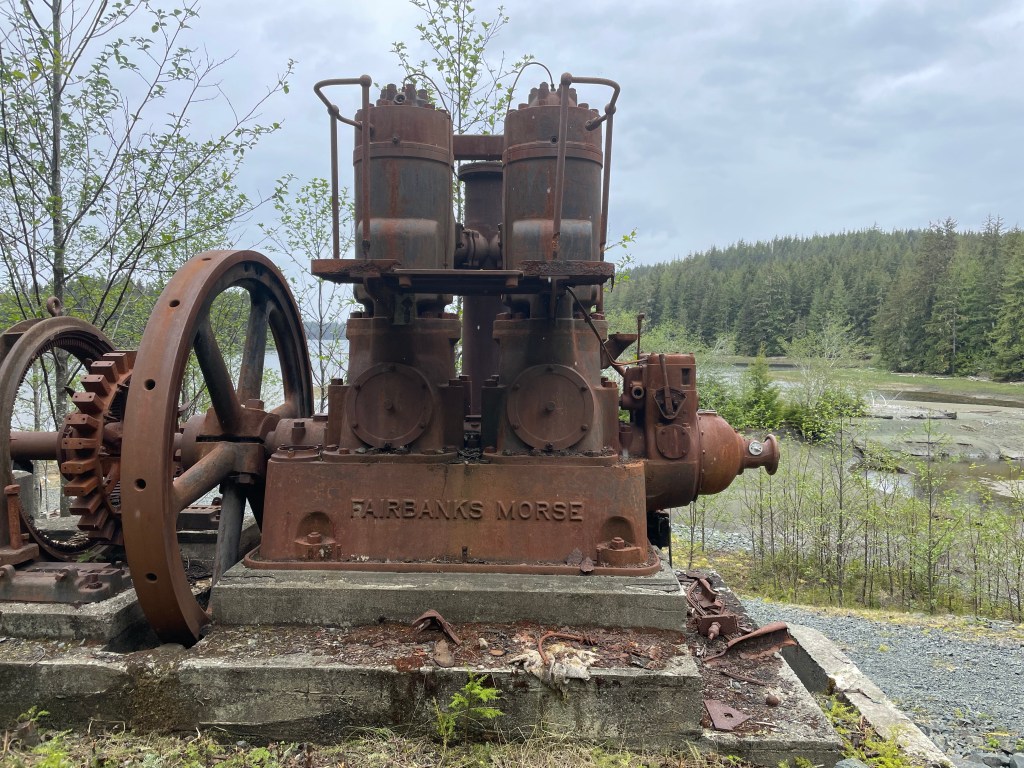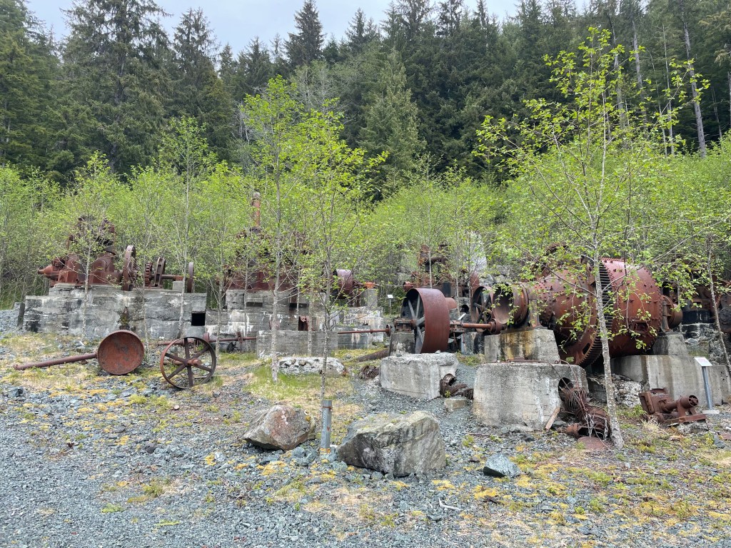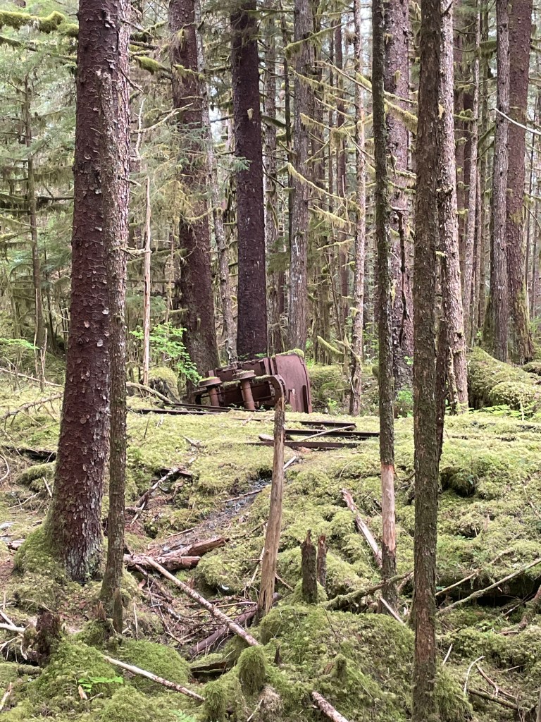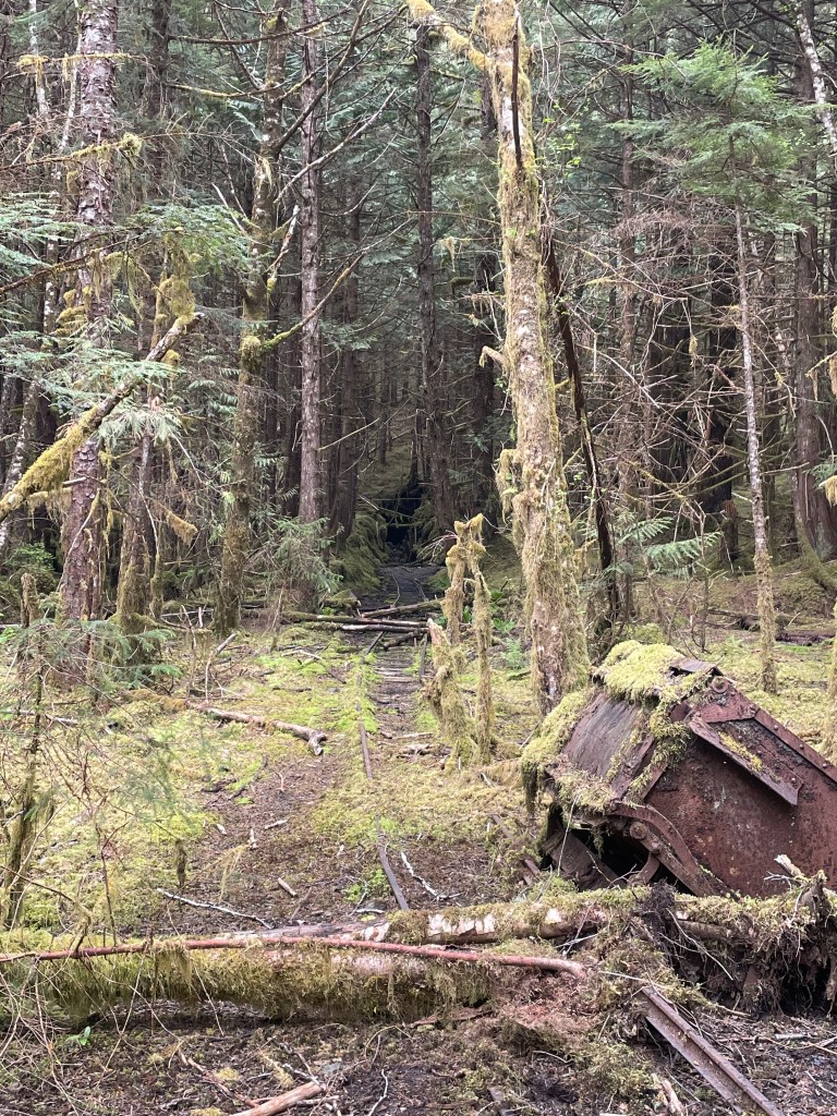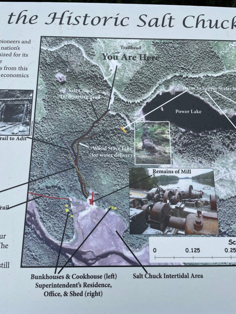 The next day we explored POW some more. We drove around Craig to get a lay of the land, then over to Klawok to look at some more totems. Then we headed east. We looked briefly at Thorne Bay, got some directions from the man in the local tackle shop, and headed out into the back country, on dirt roads. We eventually found our way to the Salt Chuck Mine Interpretive Trail – a fascinating site, full of history, natural beauty, and exemplary relics of man’s mining exploits of a bygone era.