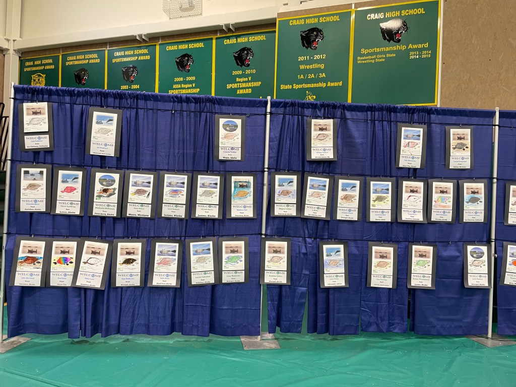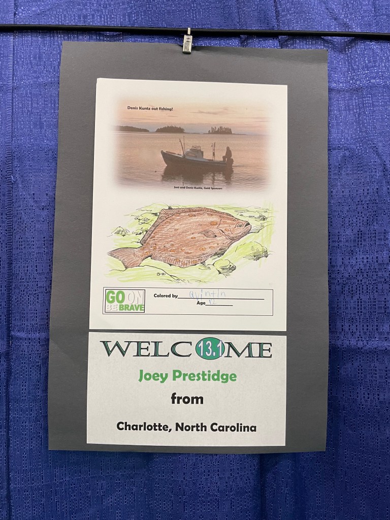 1830 rolled around and we headed back to the High School for race presentations. We had some nice brownies & ice cream, picked up the colouring-in a young student had completed for me, and sat through an arduously long presentation, raffle and prize drawing event. There were an inordinate number of prizes being drawn. I received my prize for third place overall – a beautiful wooden Halibut Fish Trophy – but we ducked out before the end, in order to make it to Papa’s before it closed. We dined in on our nice pizza and salad, then headed home to pack for tomorrow’s departure. I read a little outside, next to the gas fire pit whilst looking out over the men fishing the cove. A bald eagle flew from the roof of the house and glided back to his nest as I climbed the stairs, and bed beckoned.